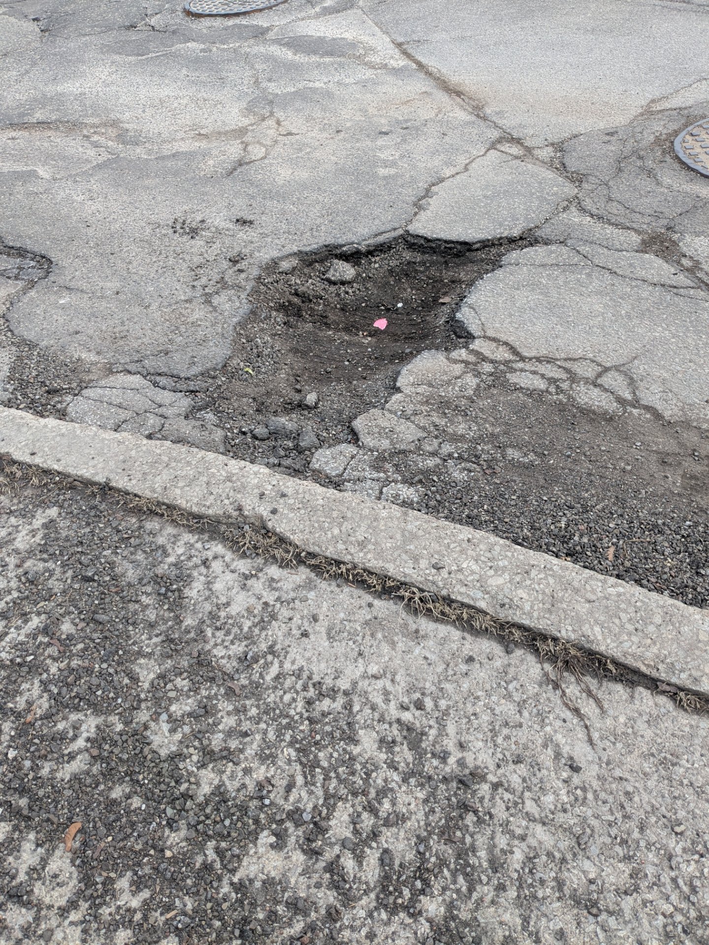 A medium-sized pothole approximately 12-18 inches across has exposed the base material at 155 Silverstone Drive, with cracks radiating outward and loose concrete sections that create a tripping hazard. The area has already been marked for municipal survey. Repair is needed to prevent further pavement deterioration and eliminate the safety risk.