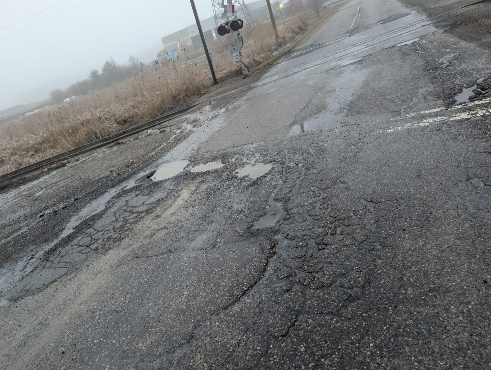 The road surface at the Glasgow Street rail crossing is severely damaged with multiple cracks and deterioration affecting pavement integrity. This road damage poses a hazard to vehicles and pedestrians and requires repair to prevent further deterioration and safety risks.