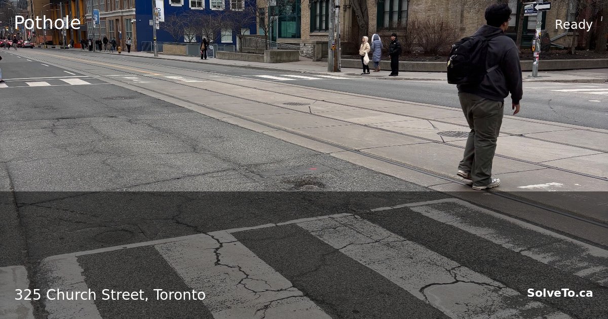 Multiple potholes and significant cracks damage the pedestrian crossing at this busy downtown intersection, with large chunks of asphalt missing from the crosswalk surface. This creates a tripping hazard for pedestrians and cyclists navigating the crossing at 325 Church Street.