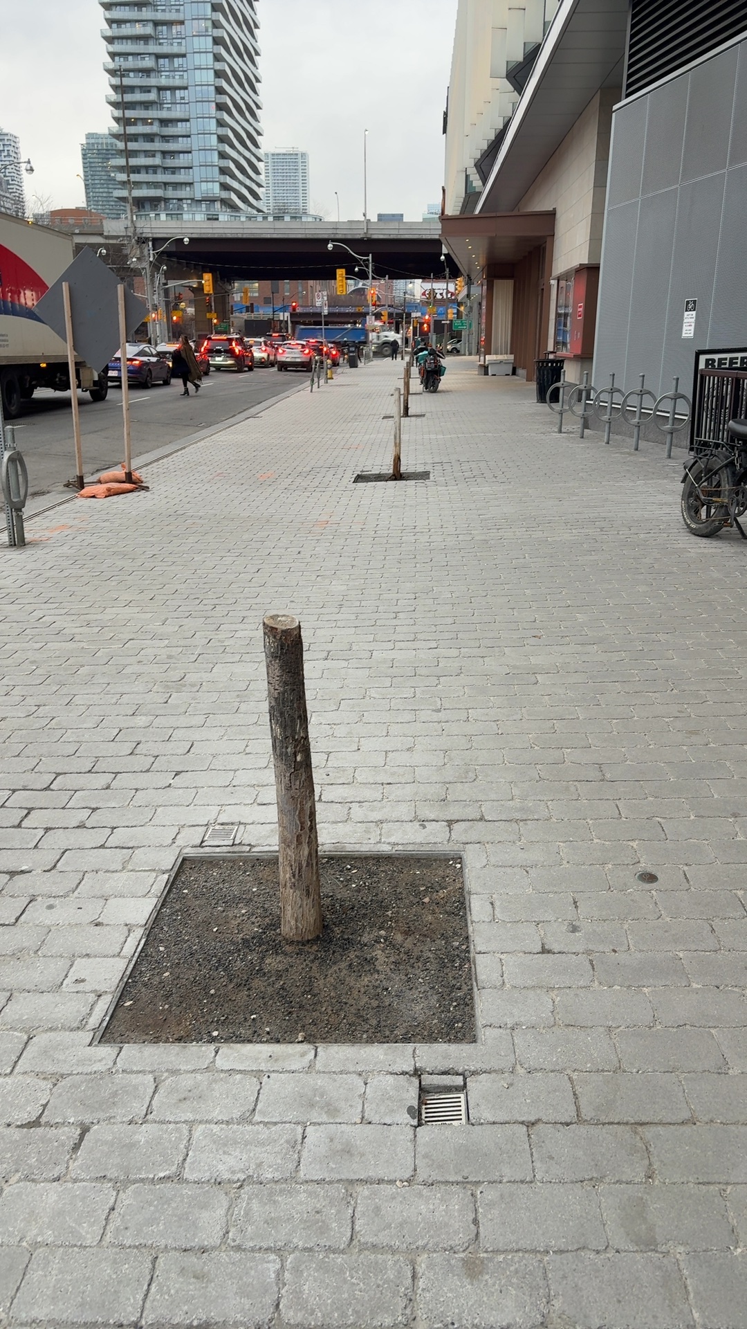 A dead tree stump approximately 4-5 feet tall is protruding from a planter bed directly in the pedestrian pathway on a high-traffic sidewalk at The Yard. The bare wooden stump with no foliage creates a tripping and collision hazard for pedestrians. The stump appears to be abandoned or neglected and requires removal or proper tree maintenance.