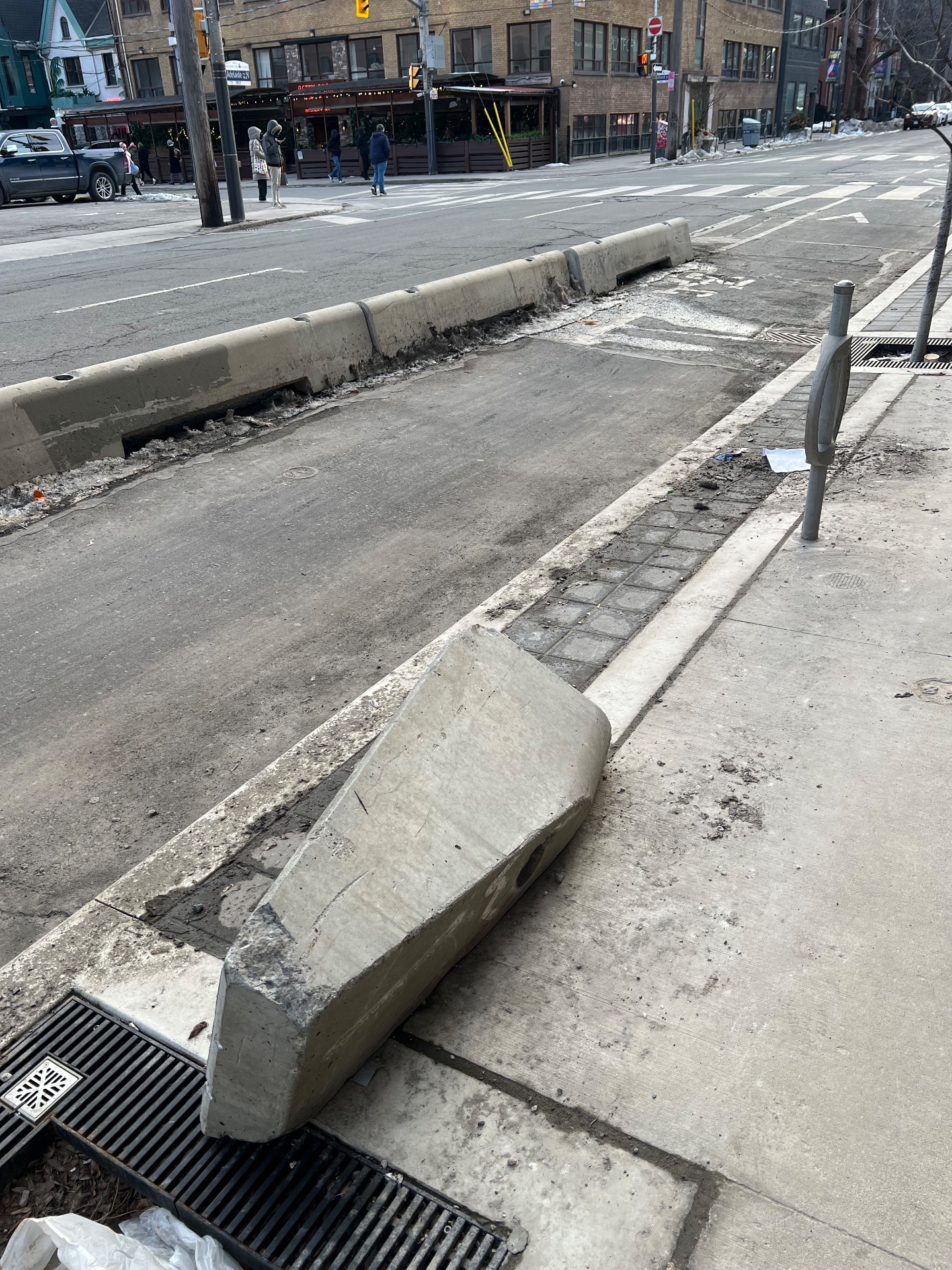 Concrete jersey barriers and bollards along the sidewalk are displaced, cracked, and misaligned, creating trip hazards for pedestrians. The deteriorating barriers obstruct the street edge and could impede emergency vehicle access or street maintenance operations.