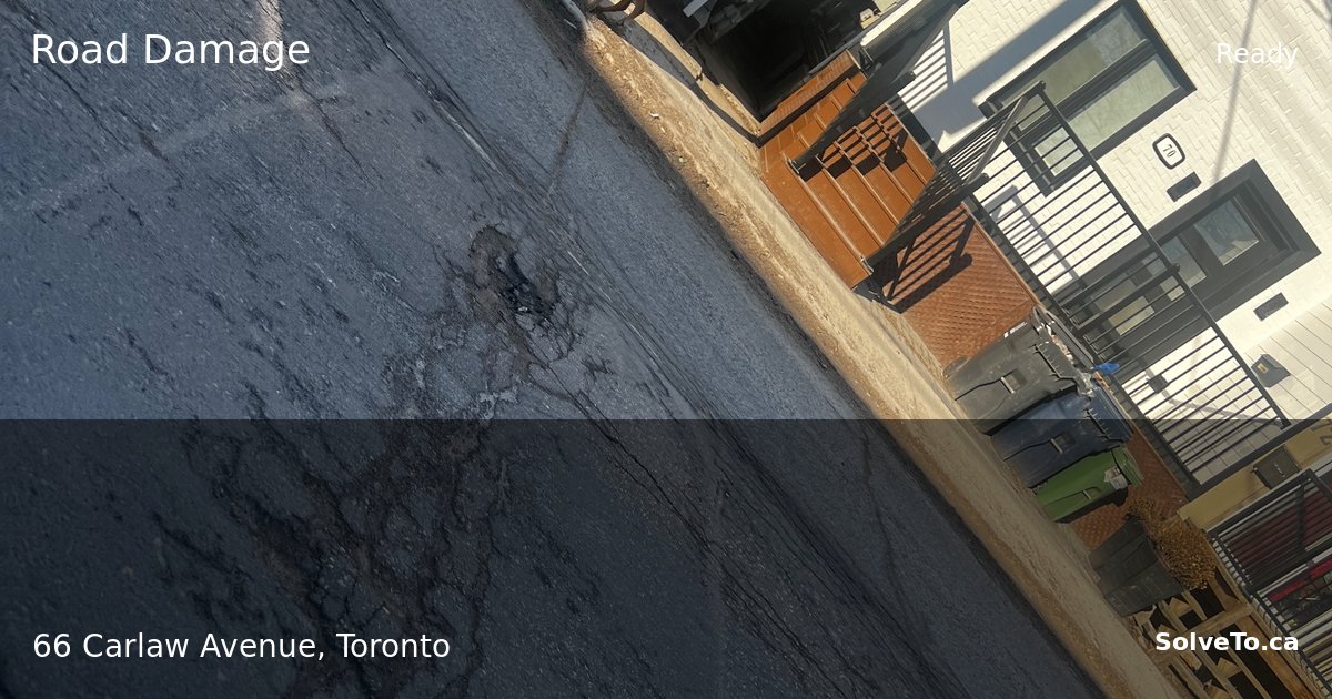 The asphalt on Carlaw Avenue between the lakeshore and Queen Street shows extensive cracking and spalling across a significant area, creating an uneven surface. The damage pattern indicates age-related wear and possible freeze-thaw damage, posing a hazard to vehicles and cyclists.
