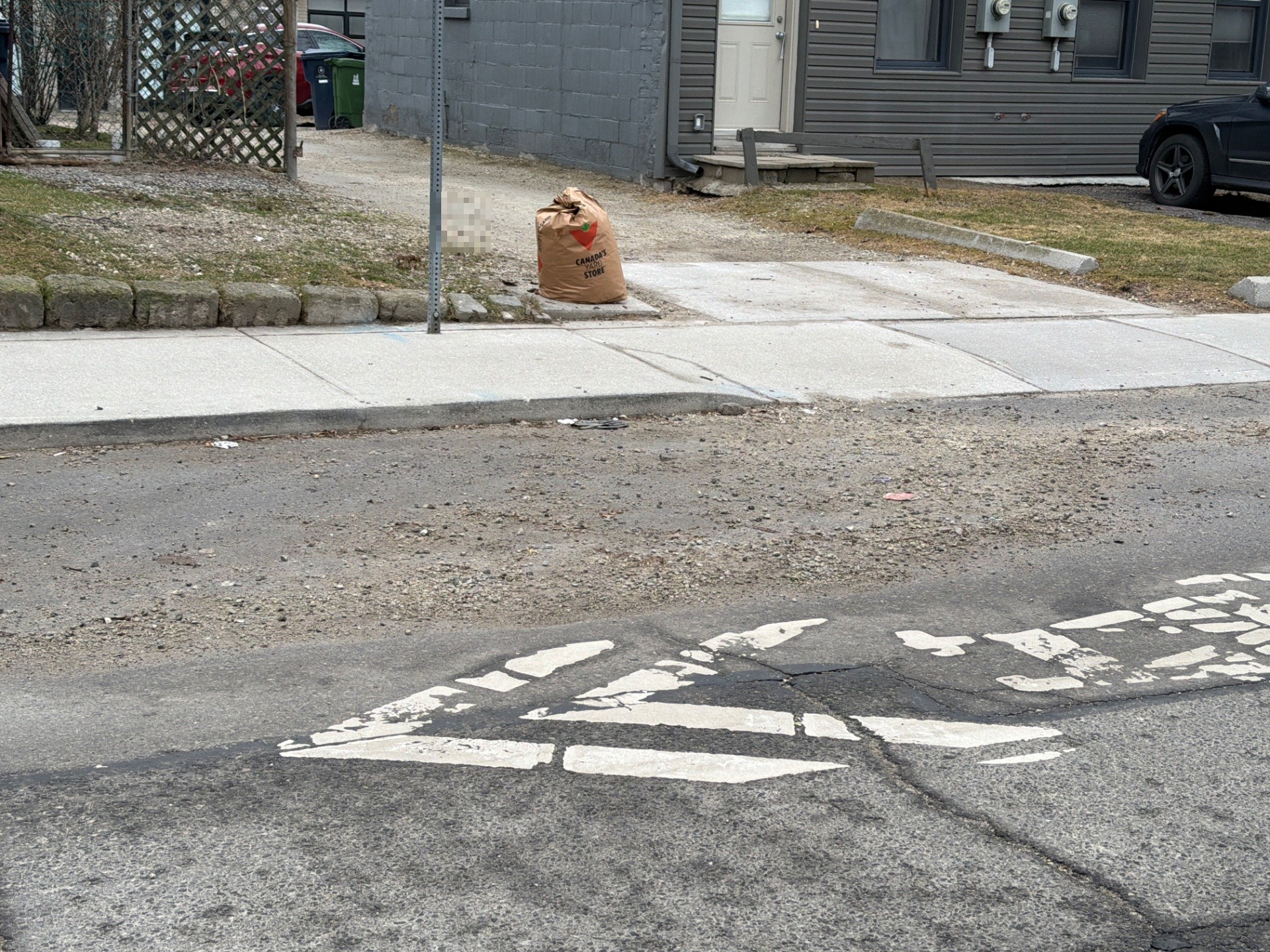 The asphalt on Richmond Street West shows visible cracking and deterioration affecting the road surface. This damage creates a hazard for vehicles and pedestrians in the area.