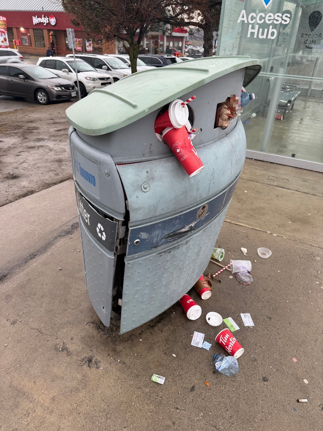 Litter bin #6079 on Ellesmere Road is overflowing with garbage and not being emptied regularly enough to handle the volume of waste in the area. Prompt collection is needed to prevent litter from spilling onto the street and sidewalk.