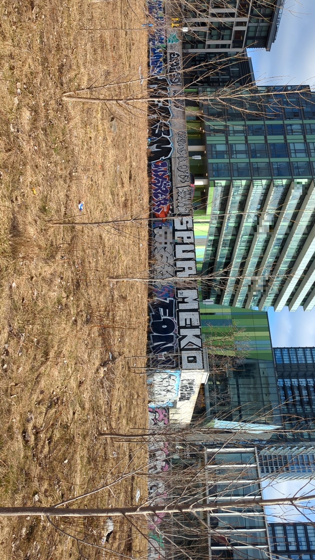 Graffiti is present on a structure at 150 Queens Wharf along Iceboat Terrace. The tags cover a medium-sized area and should be removed to maintain the appearance of this waterfront location.