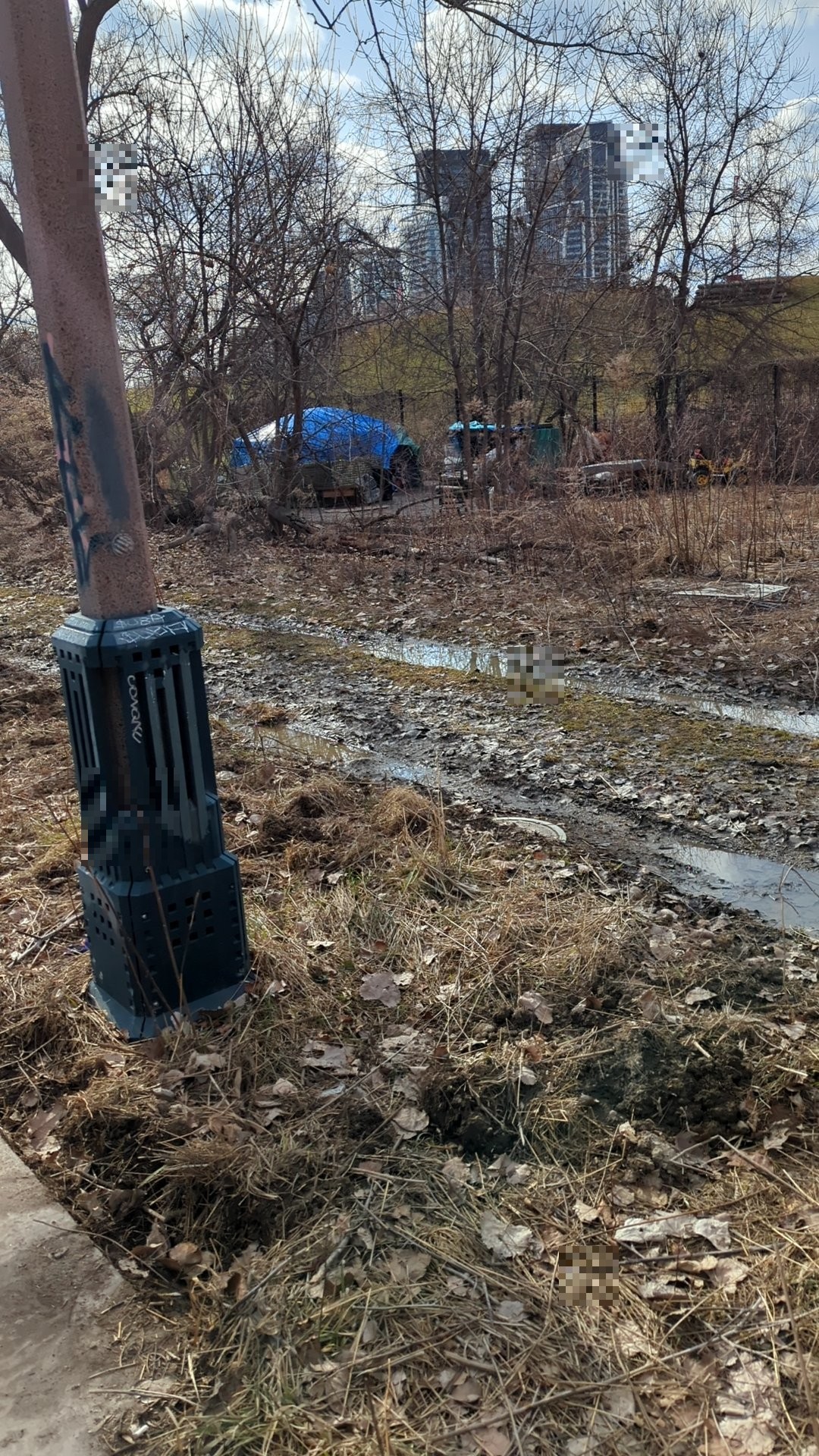 An encampment has been established at 250 Fort York Boulevard for approximately 3.5 years, with an unleashed dog present on the property. The situation poses safety concerns due to the unleashed animal and the extended duration of the encampment in this public area.