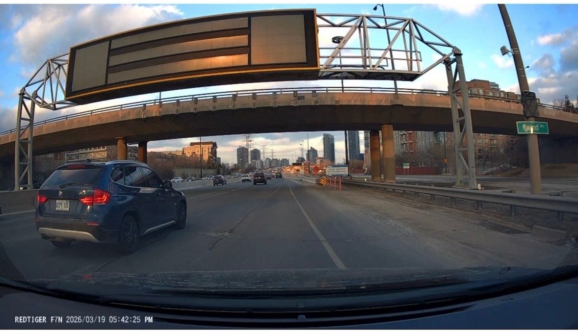 Missing lane markings on the eastbound Gardiner Expressway are creating a hazard, with drivers unintentionally merging into adjacent lanes due to inability to distinguish lane boundaries. The reporter has witnessed multiple near-collisions in this area and has dashcam footage documenting the issue. Lane lines need to be repainted to restore safe visibility.