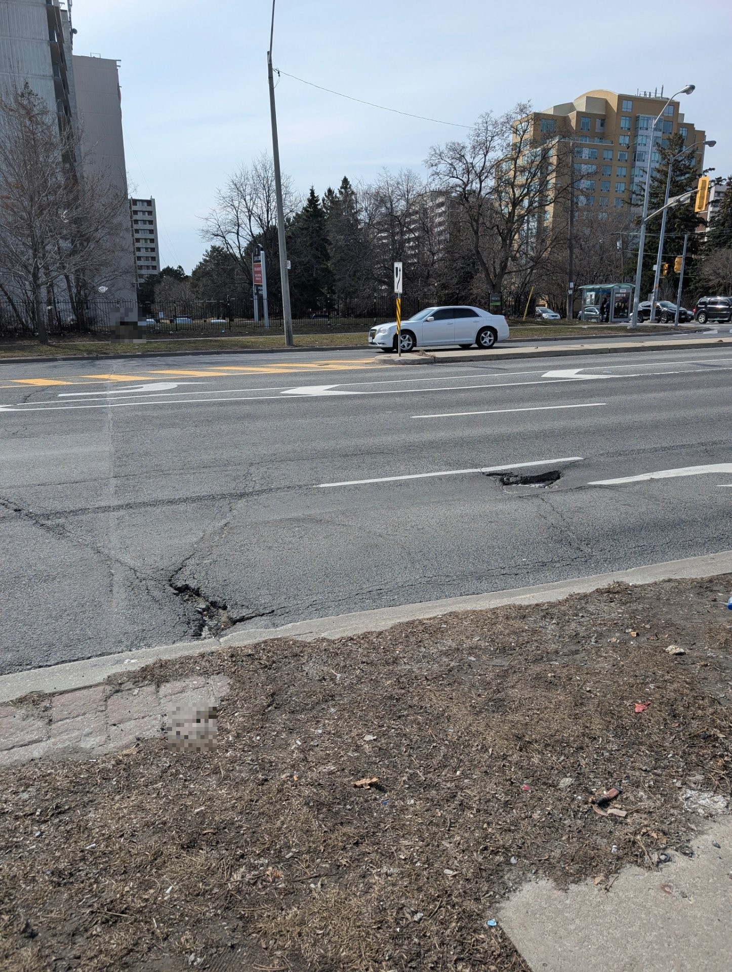 A few potholes, but a big one around 5-6 inches deep and 2-3 feet wide. Right turning lane