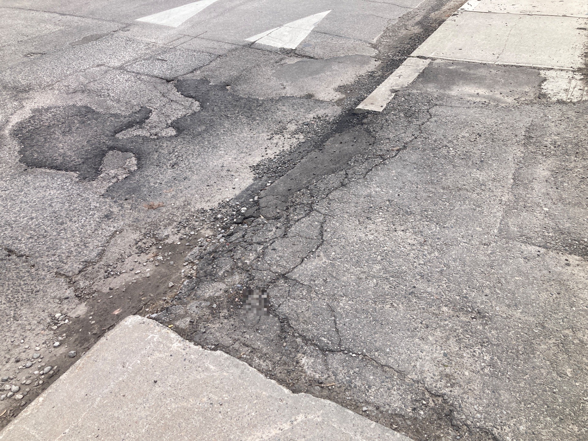 The road surface at 79 Redpath Avenue shows significant deterioration with visible cracks and potholes that pose a hazard to vehicles and pedestrians. Repair or resurfacing is needed to prevent further damage and safety risks.