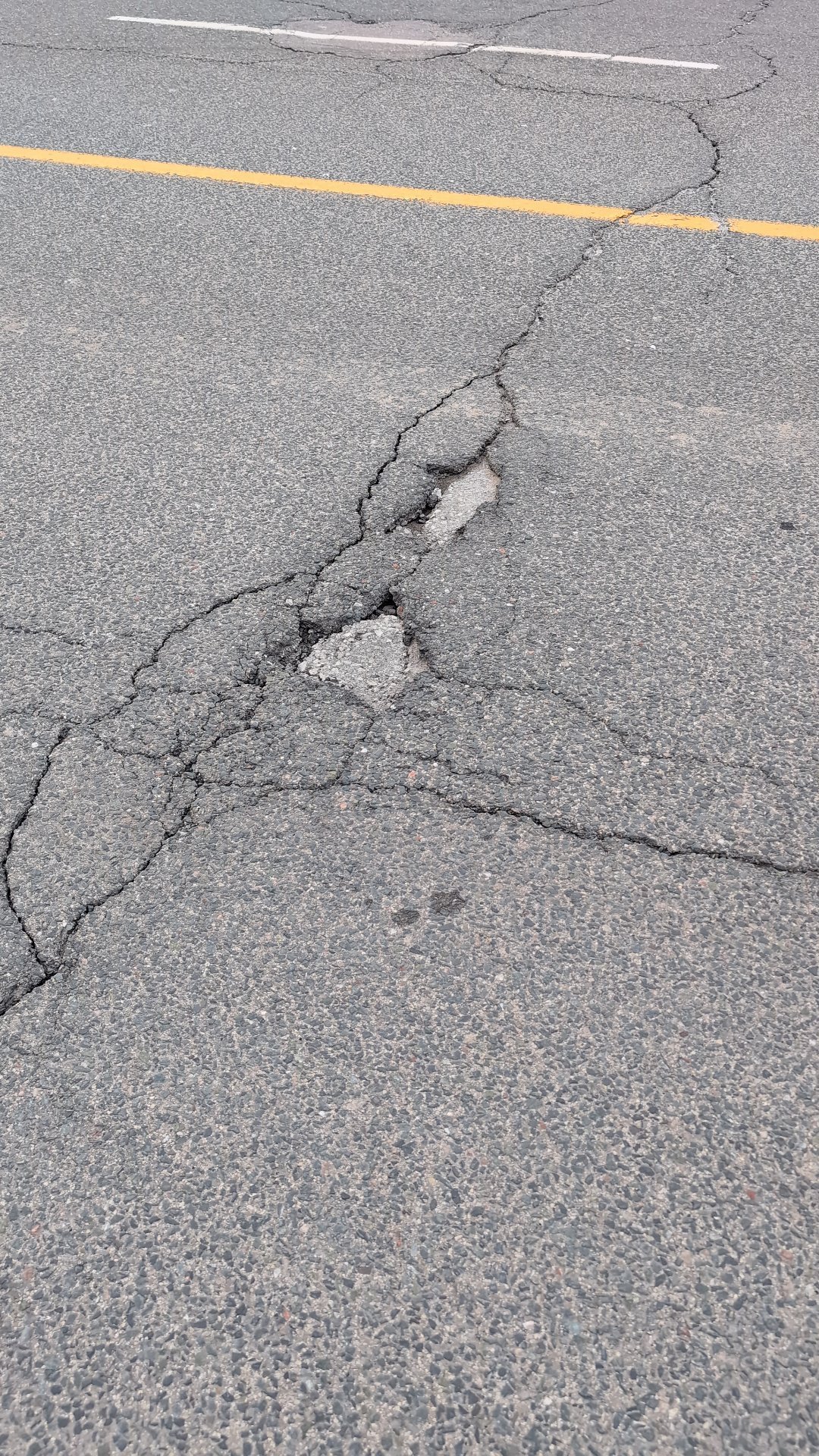 Medium-severity road damage at 56 Westmore Drive. The area has aging catch basins from the 1970s within 100 meters, which may be contributing to drainage issues and pavement deterioration.