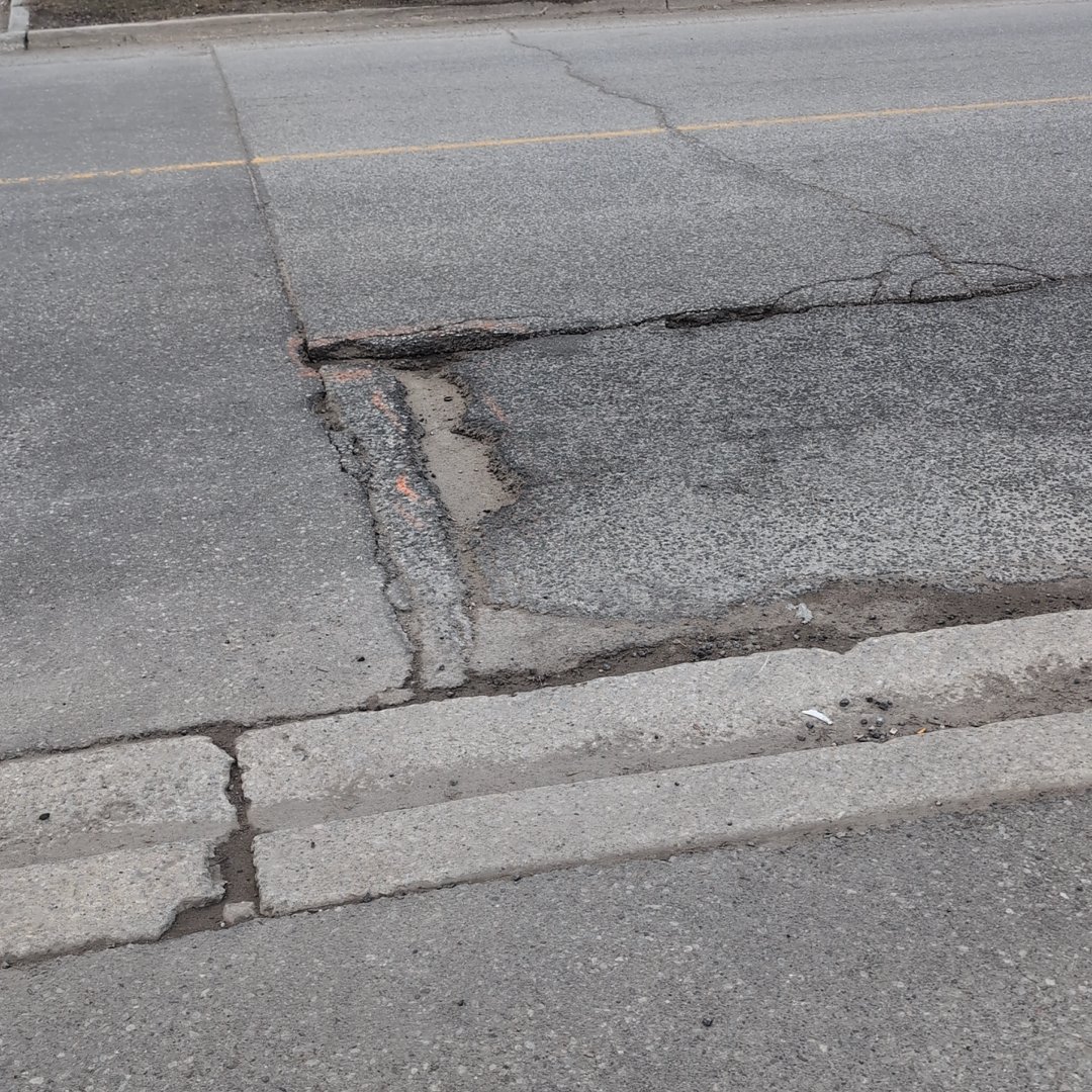 Road surface damage at 69 Racine Road requires repair. The area has aging drainage infrastructure with catch basins averaging 46 years old, which may be contributing to the deterioration.