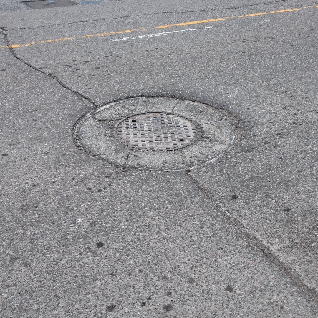 Severe road damage at 9 Racine Road. The area has aging drainage infrastructure with five catch basins averaging 50 years old, which may be contributing to the pavement deterioration.