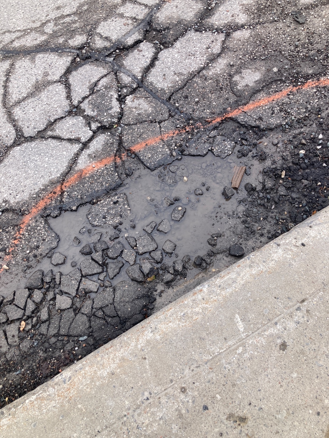 Large pothole approximately 2–3 feet in diameter with significant depth and standing water at 823 Pape Avenue contains exposed broken asphalt and rebar, posing risks to vehicle suspension and creating a tripping hazard. An orange utility marking line runs through the damaged area, and the surrounding pavement shows extensive cracking and spalling. Poor drainage from the depression is allowing water to accumulate, and the nearby catch basins (averaging 109 years old) may be contributing to the surface deterioration.