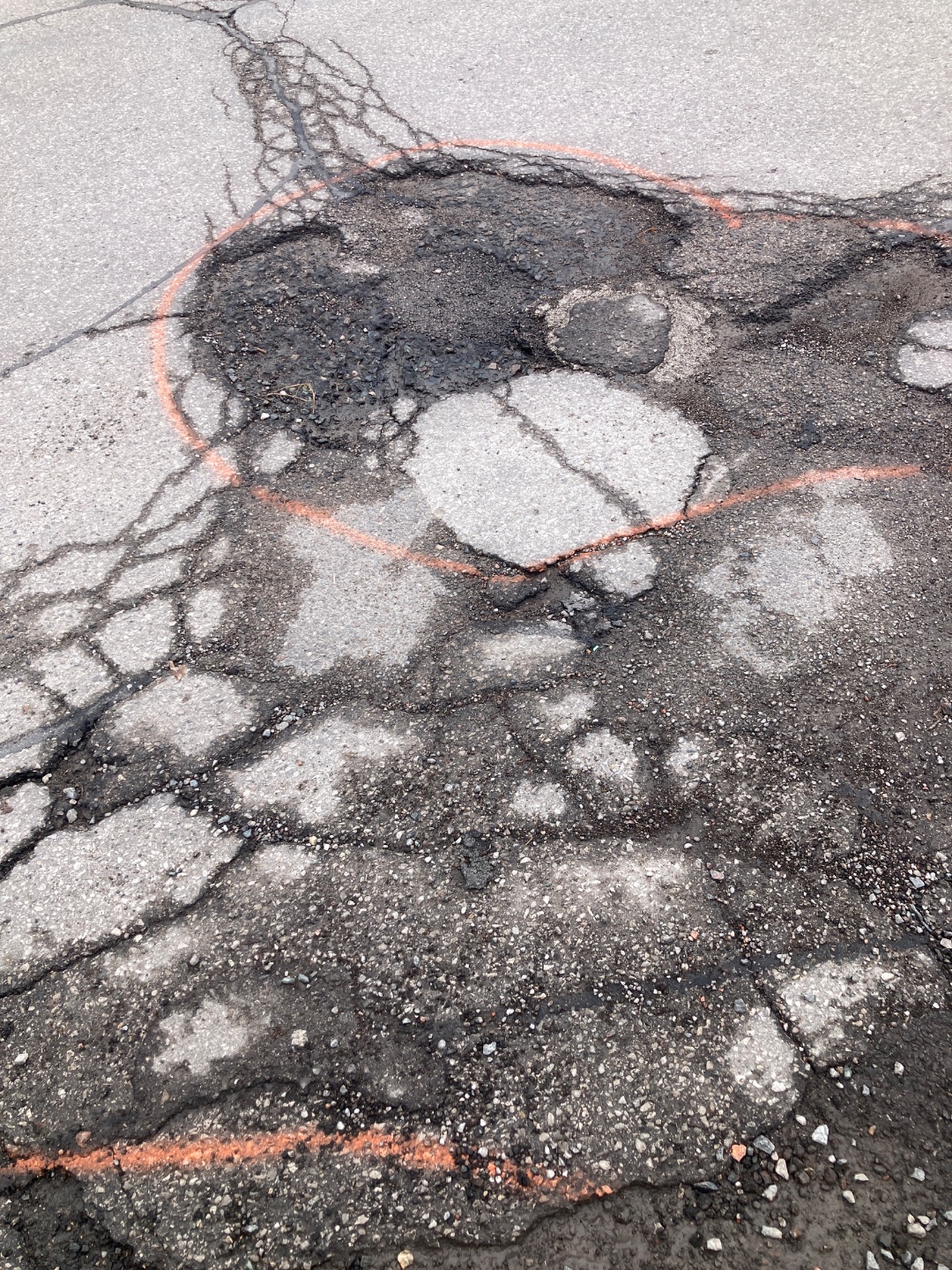Road surface damage covering approximately 3-4 square meters on Selkirk Street has deteriorated with large sections of asphalt missing, exposing the concrete base and aggregate. An orange spray-painted utility cut mark is visible, and the damage creates uneven surfaces and trip hazards. The exposed subsurface and cracking pattern suggest water infiltration or improper utility repair restoration.
