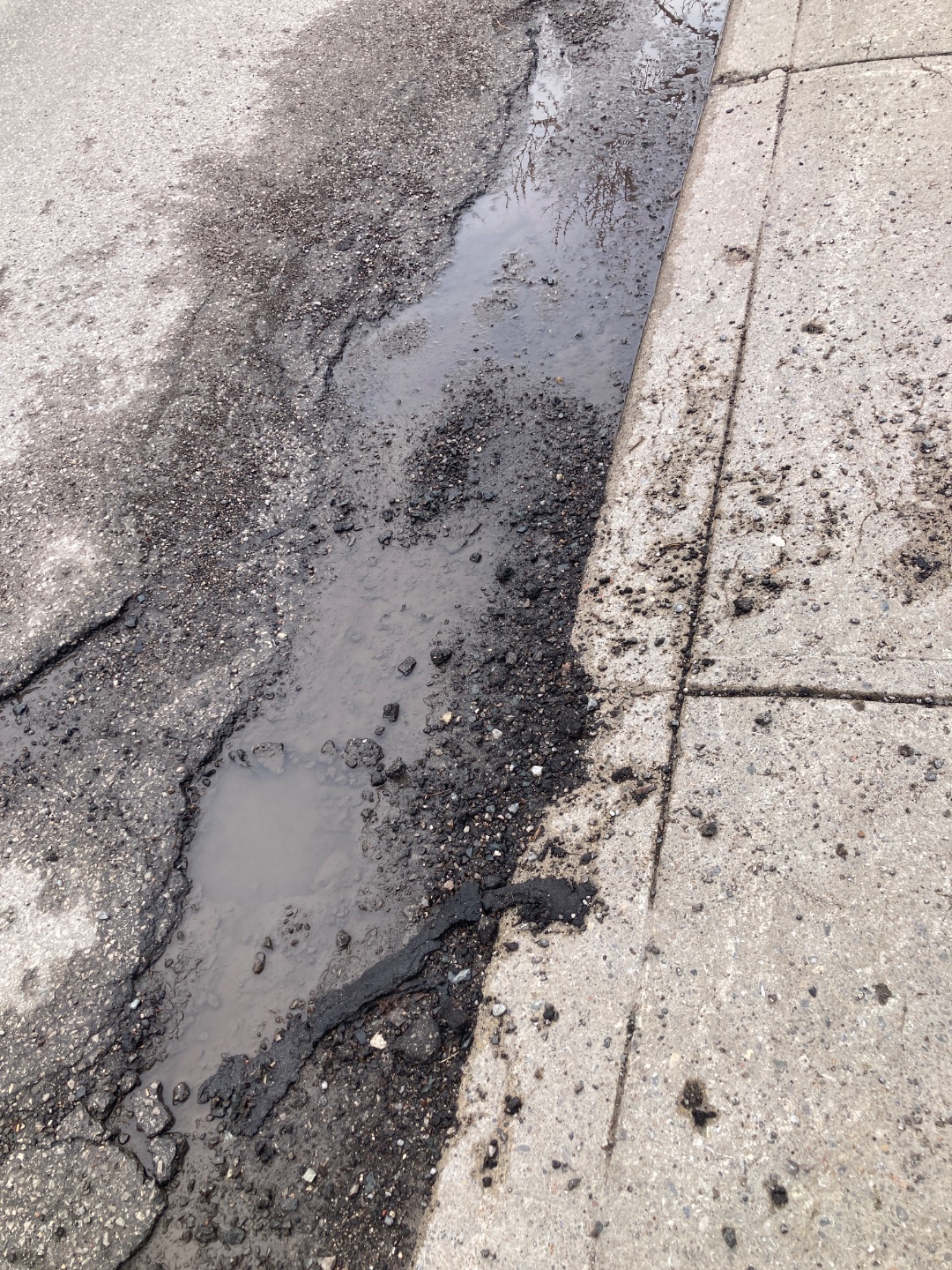 Standing water is pooled on the road surface adjacent to the concrete sidewalk on Selkirk Street, with visible sediment and debris indicating a blocked or inadequate storm drain. The depression in the asphalt is collecting water instead of allowing drainage, creating a tripping and slip hazard for pedestrians. A catch basin or storm drain near the fire hydrant location appears to be blocked.