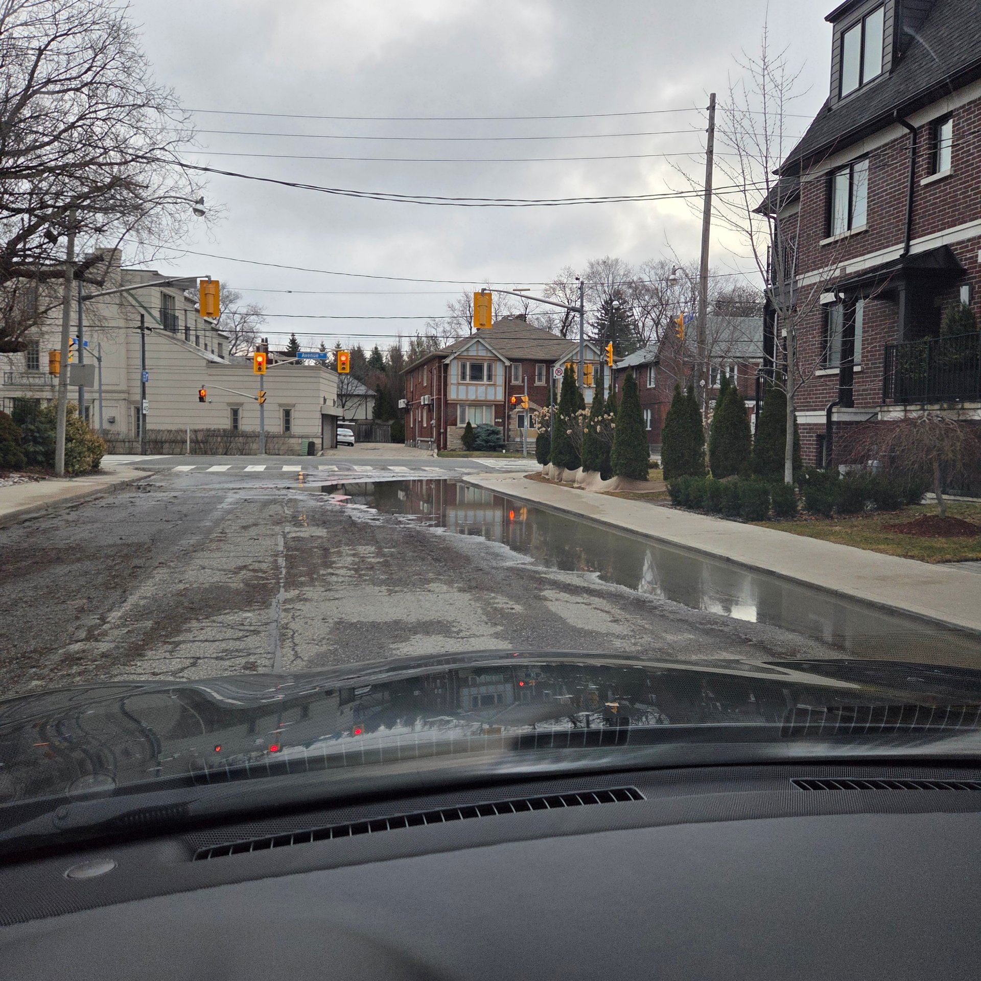 This is the corner of Lytton Blvd and Avenue Road at 8 am. Storm sewer is blocked. It is also set too high and floods even when not clogged with debris.
