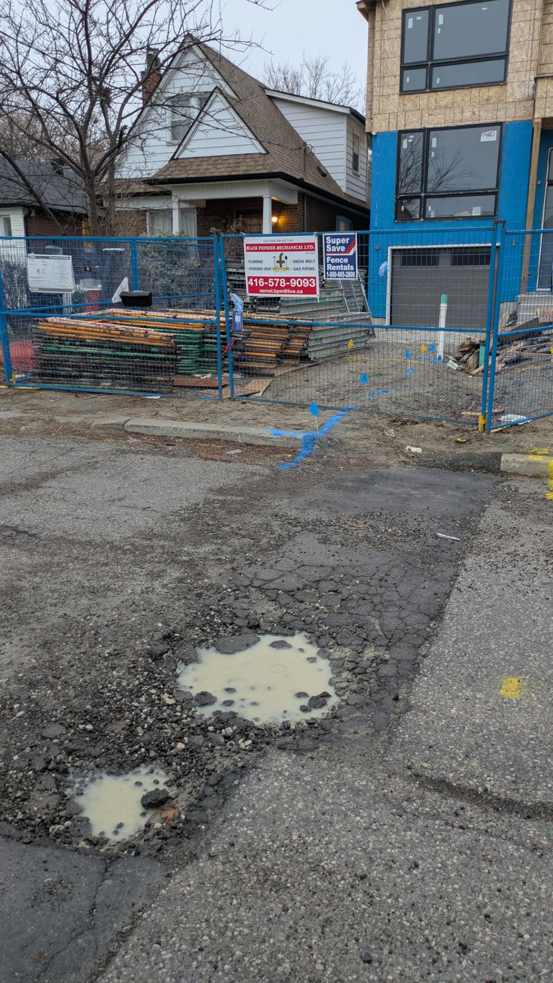 The company renovating the house damaged the municipal road and did not fix it properly. Now there are big and deep potholes on the residential road.