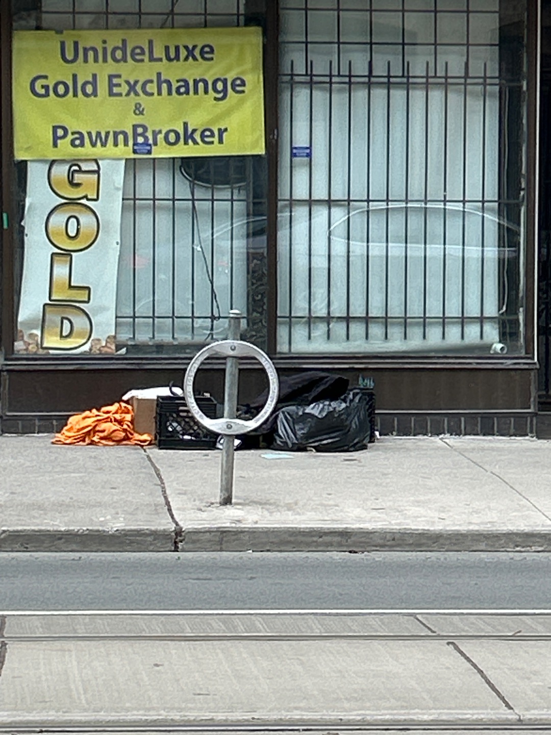 Multiple abandoned items—an orange fabric pile, black plastic garbage bag, and cardboard box—are scattered along the sidewalk in front of a closed storefront at 115 Church Street, obstructing pedestrian access and creating a tripping hazard. The refuse is dumped on public property with no person present. Despite three nearby litter bins serviced seven times weekly, the items remain discarded at the building base.