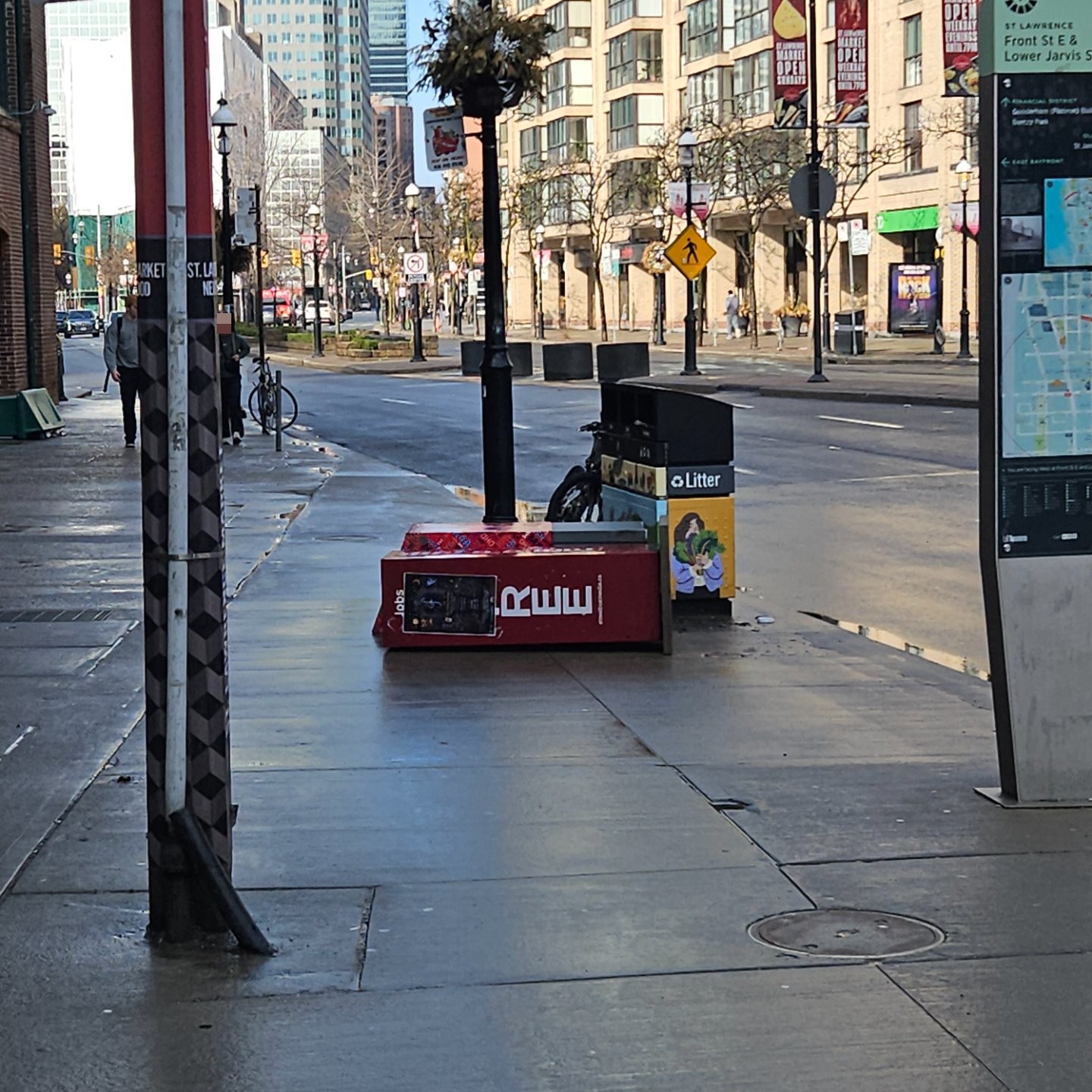 A red planter/kiosk structure is blocking the entire sidewalk width at the intersection of Front and Lower Jarvis, forcing pedestrians into the street and creating a tripping hazard and accessibility issue. The structure appears unmaintained with visible debris and buildup on top.