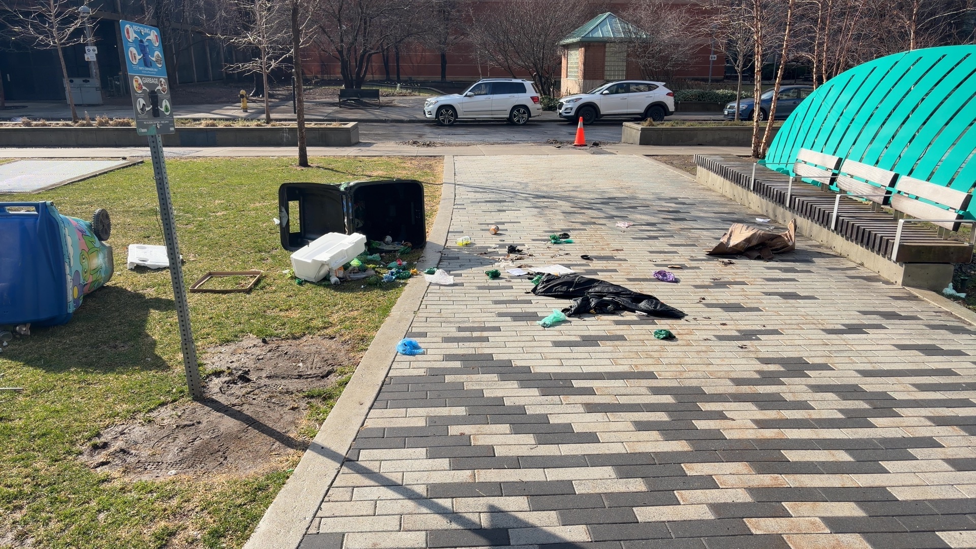 Dr Lillian McGregor Park has scattered garbage and debris across the paved walkway, including multiple black garbage bags, discarded personal items, and an overturned black garbage bin with spilling contents on the grass. Items are obstructing the main pedestrian pathway and creating a tripping hazard. The accumulation suggests improper waste management or unauthorized dumping.