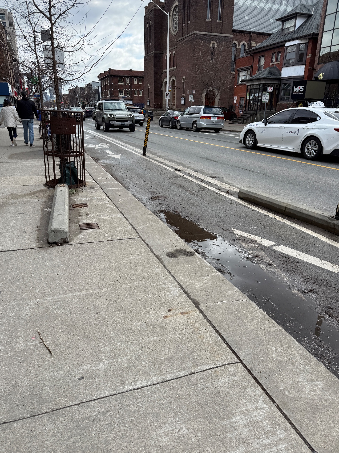 A concrete curbstone at 1042 Bloor Street West is lying flat on the sidewalk instead of standing upright at the curb, creating a tripping hazard and obstruction for pedestrians. The displacement may be related to subsurface drainage or sewer work in the area, and the stone requires professional reset and repair.