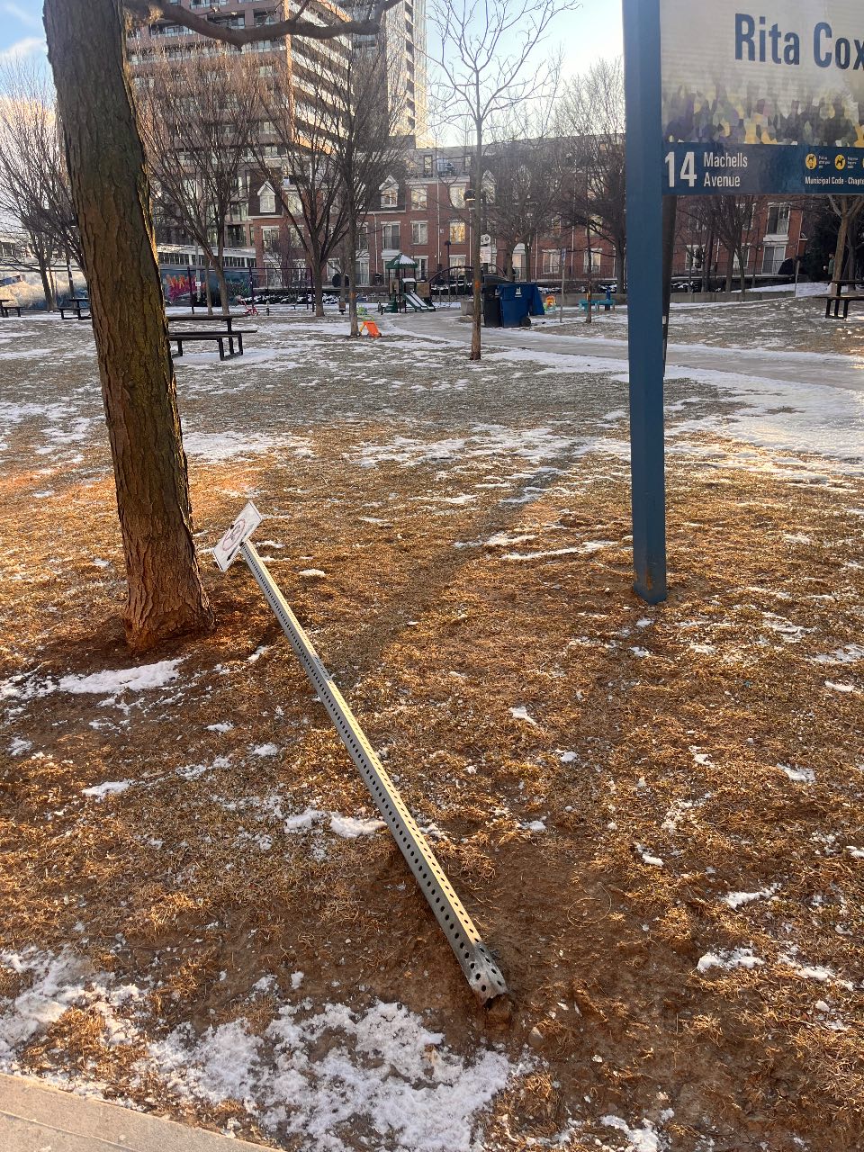 Fallen metal sign post leaning against a tree near the playground. Sharp edges, tripping hazard for kids.