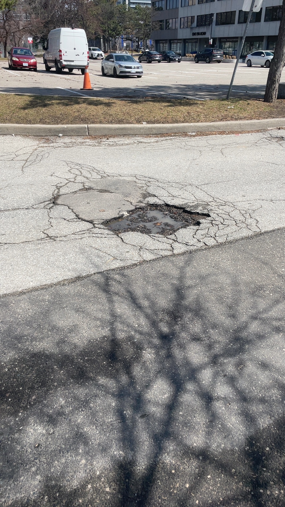 A large pothole approximately 2-3 feet in diameter with extensive radiating cracks is located at 15 Eva Road in an active traffic area. The hole contains water and debris, creating a tripping hazard and risk of vehicle damage, with cracking and deterioration spreading across the surrounding pavement. Nearby catch basins installed in 1960 suggest aging drainage infrastructure in the area.