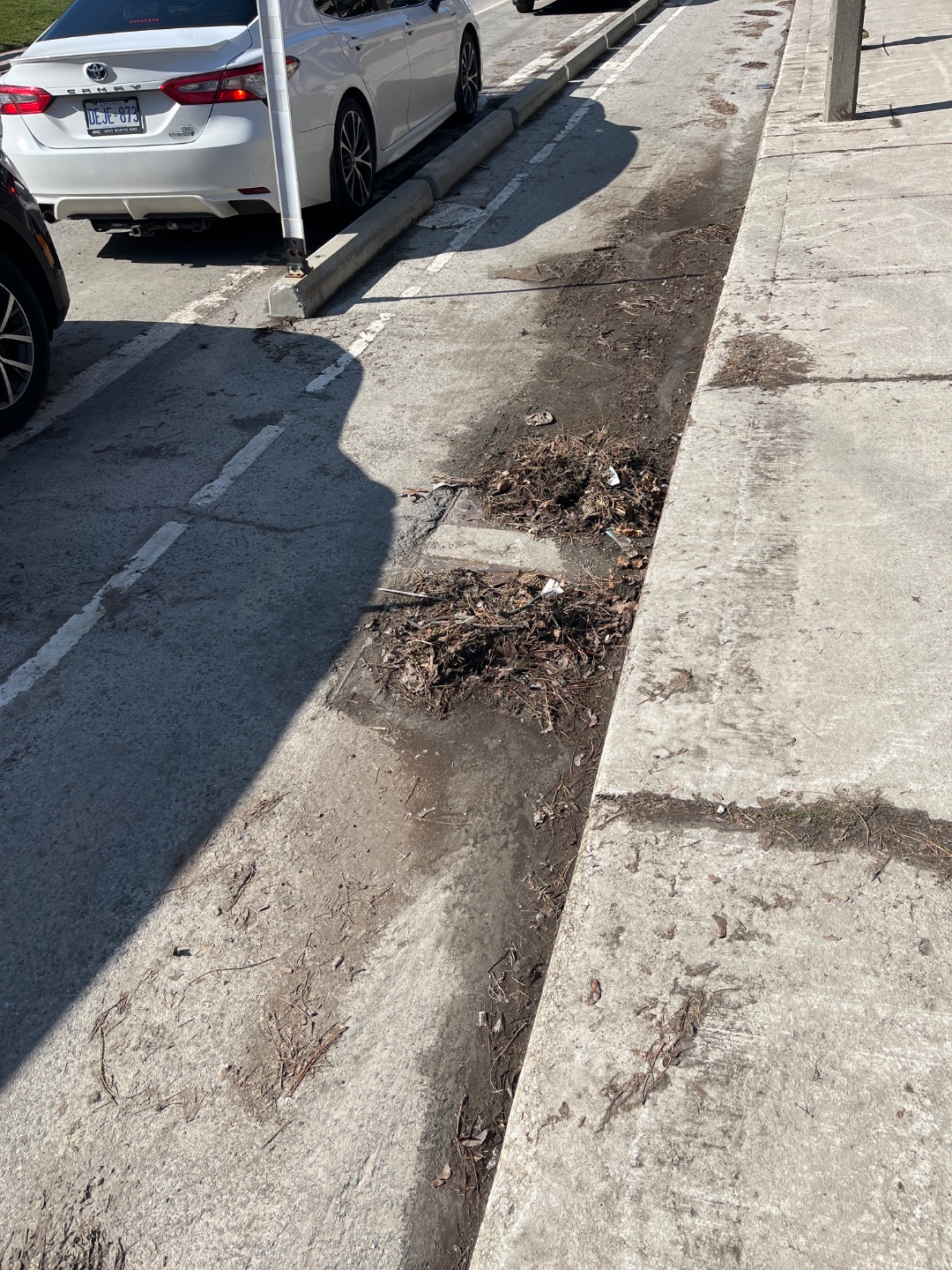 Accumulated debris including dead leaves, dirt, and organic material is scattered along the sidewalk edge and curb line at 184 River Street, blocking the drainage area between the road and sidewalk. This buildup is impeding water drainage toward nearby catch basins and creating a cluttered appearance. No hazardous materials or sharp objects are present.