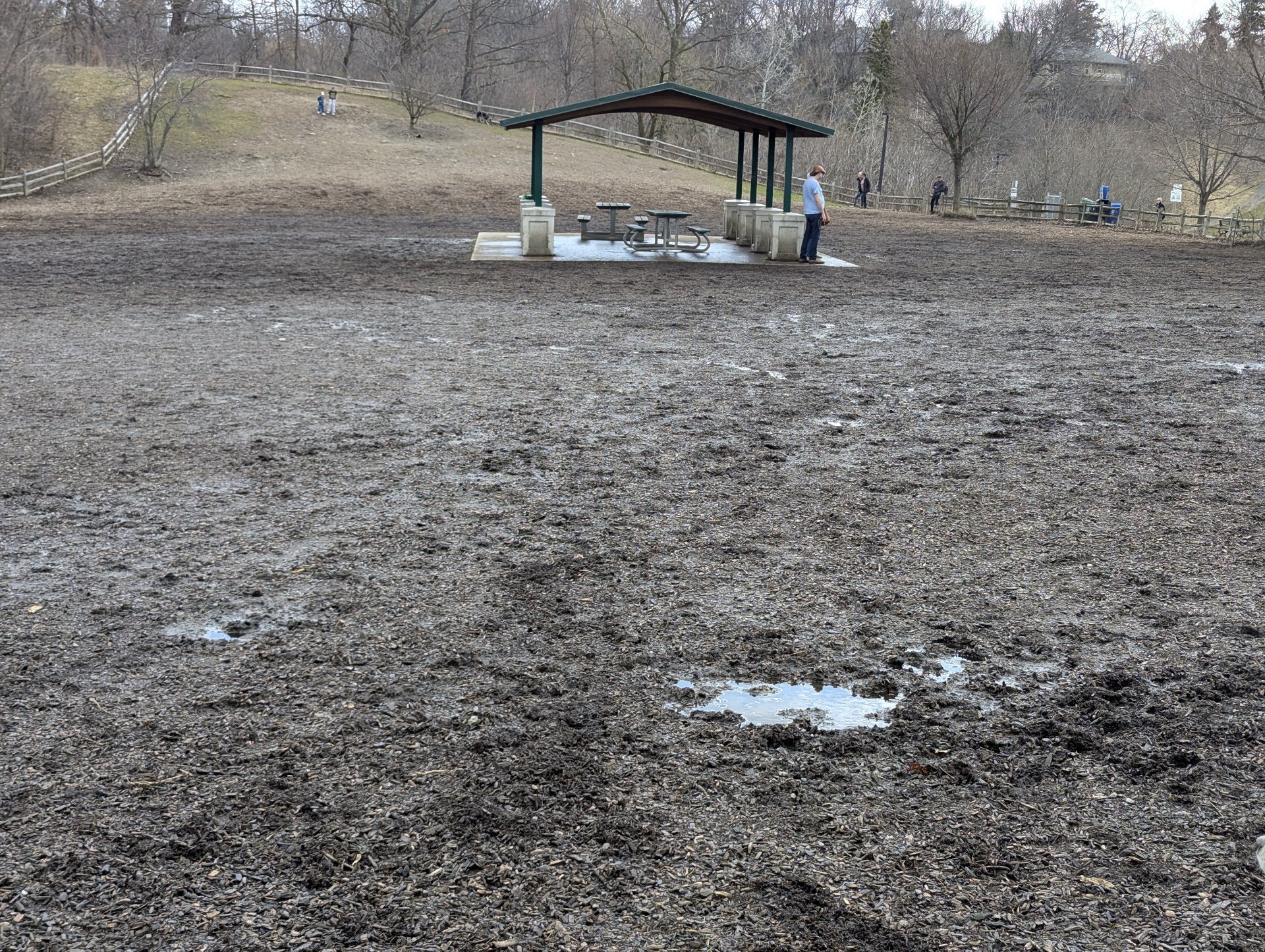 The dog park at Cedarvale Park needs a refill of wood chips. It gets incredibly muddy when it rains, and the water drainage of the area is incredibly poor, leaving puddles around the park after it rains. The park has not had wood chip refills in a very long time.