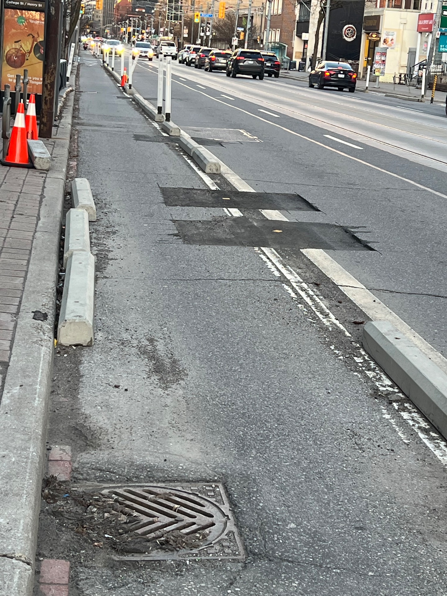 Concrete barrier posts protecting the cycle track are misaligned and displaced from their intended positions, creating an irregular obstacle course for cyclists and pedestrians. The displaced white posts compromise the bike lane protection and pose a tripping hazard along the sidewalk.