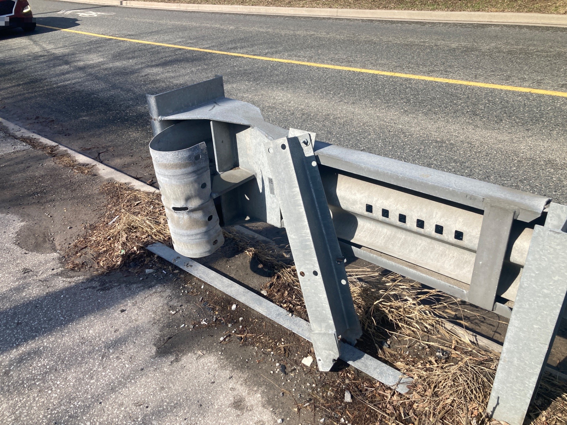 Fallen street infrastructure including metal posts, concrete base components, and cylindrical mounting hardware is lying across the sidewalk and curb on Pottery Road, creating a tripping hazard and blocking pedestrian access. The equipment appears to be from a traffic control or utility mounting system and partially obstructs the sidewalk adjacent to the roadway.