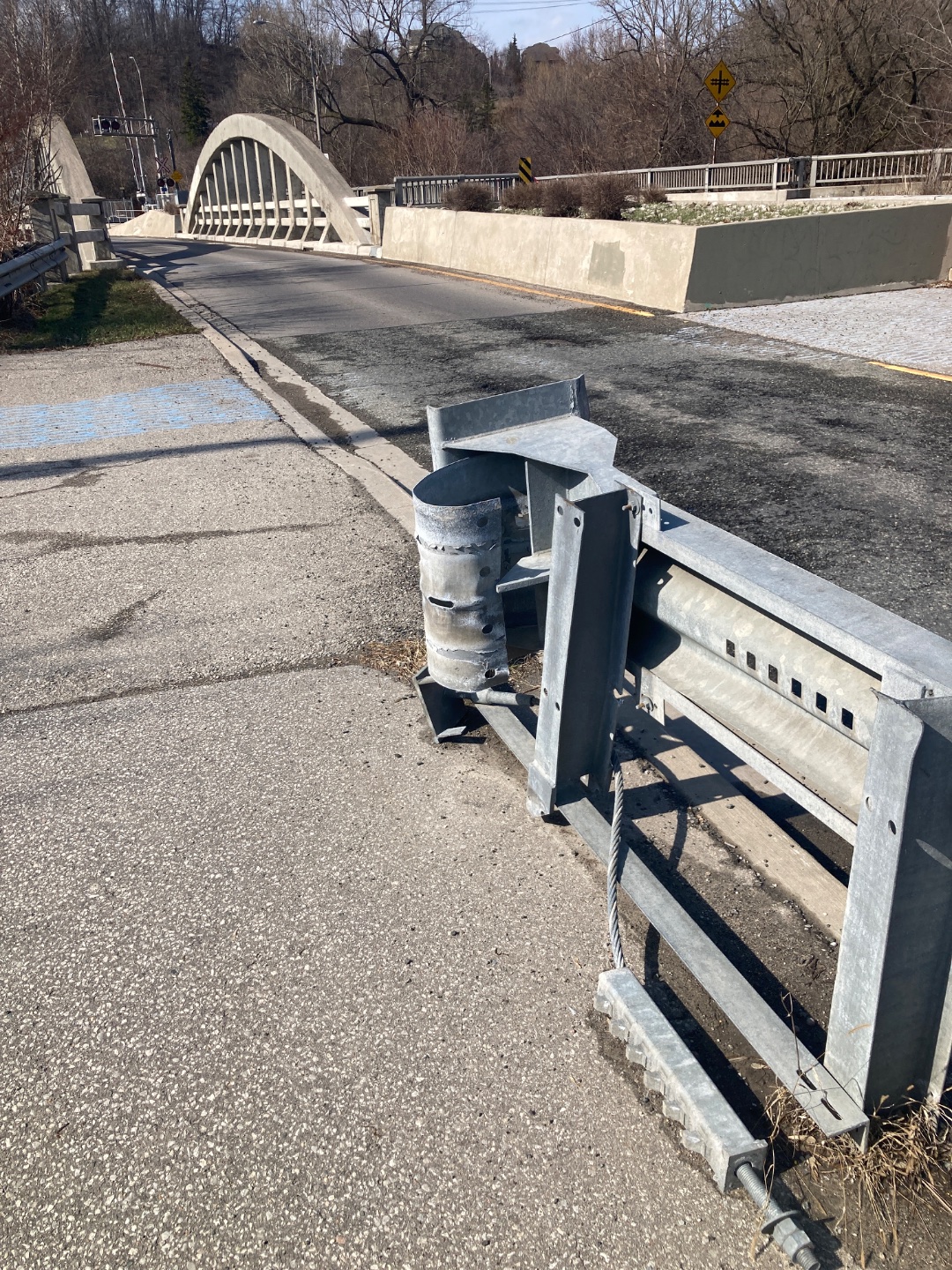 A metal catch basin drainage apparatus is displaced and lying across the road surface near a concrete bridge approach on Pottery Road, blocking part of the roadway. The displaced structure creates a tripping hazard and potential drainage blockage, with the location near a marked bike lane increasing safety risk for cyclists. The assembly consists of a cylindrical metal component with white and dark metal brackets that were previously installed as part of the stormwater drainage system.