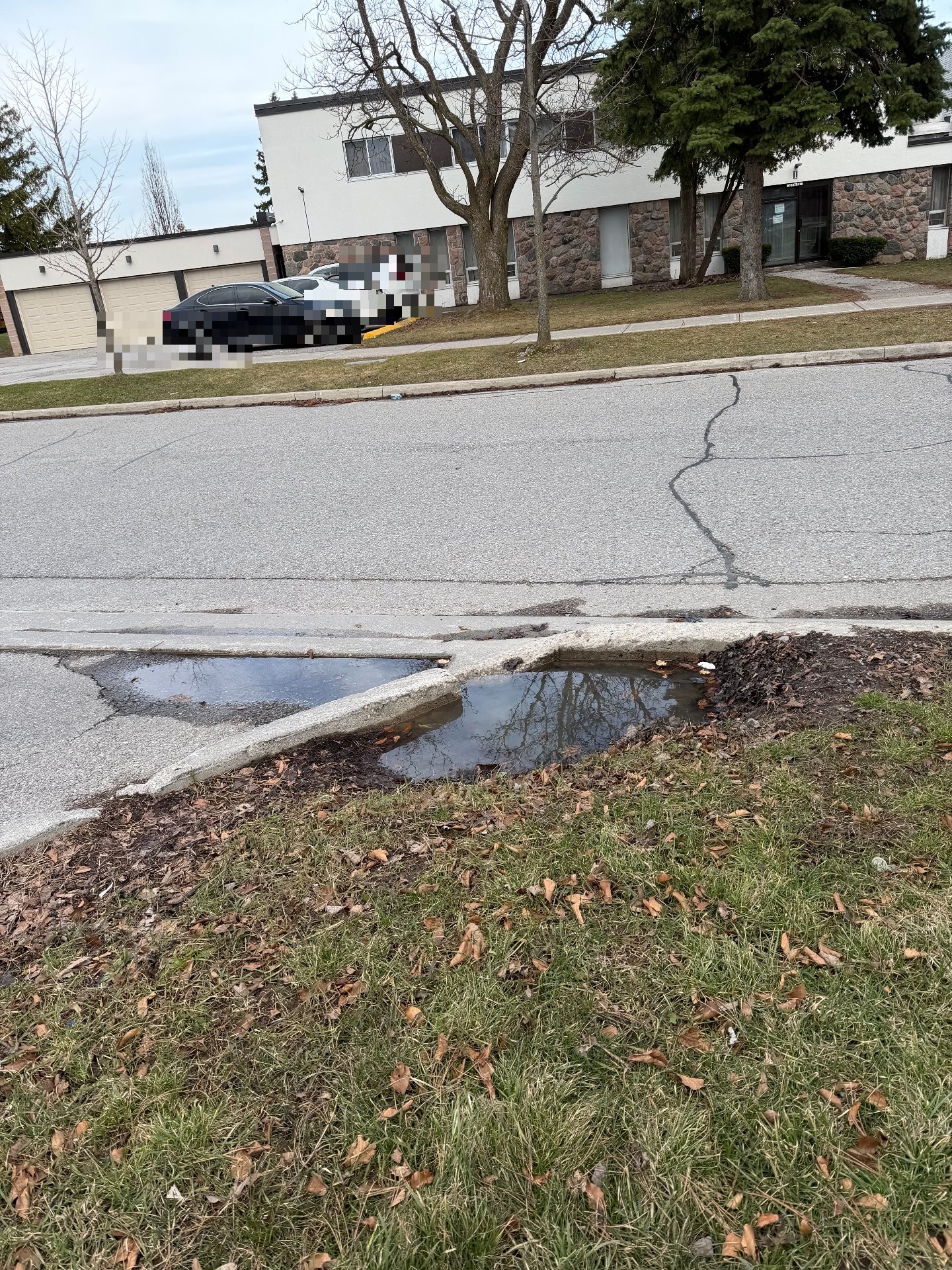 A large depression in the curb and grass verge contains 12-18 inches of standing water, with radial cracking in the adjacent asphalt indicating subsurface settlement and a blocked or failed storm drainage system. Exposed soil and mud surround the hole, creating a tripping hazard. The five catch basins in the area average 62 years old and may require inspection or maintenance to resolve the drainage failure.