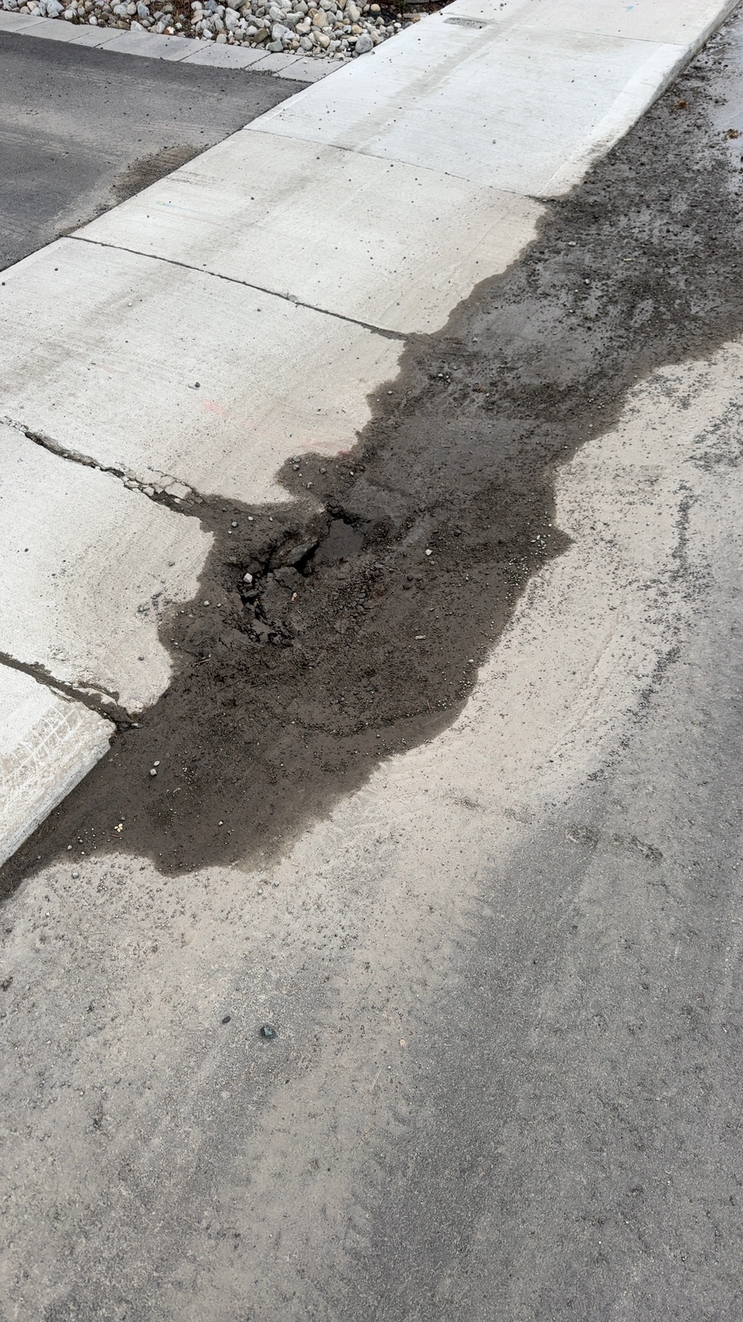 Concrete sidewalk sections at this location are settled and uneven with visible heaving and an erosion channel across the surface edge, creating a trip hazard. Soil displacement has formed a depression indicating subsurface water movement or erosion beneath the sidewalk, likely related to nearby catch basin or sewer infrastructure. The underlying structural instability requires investigation and repair to prevent further deterioration and user injury.