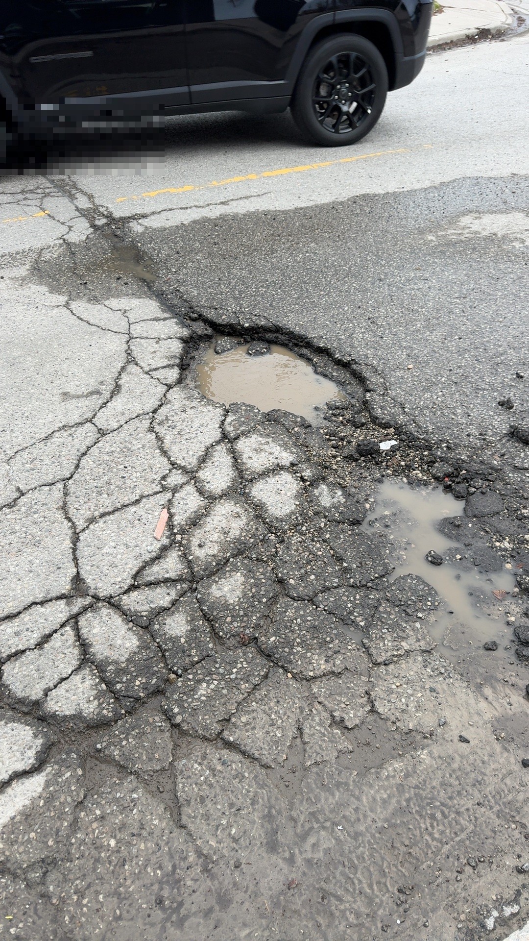 A large pothole approximately 2-3 feet in diameter with muddy water pooled inside is located on Schell Avenue, surrounded by extensive radial cracking and deteriorating asphalt. The crater shows deep structural damage with loose and missing asphalt fragments around the perimeter, with multiple secondary cracks extending across the road surface creating a tripping and vehicle hazard.