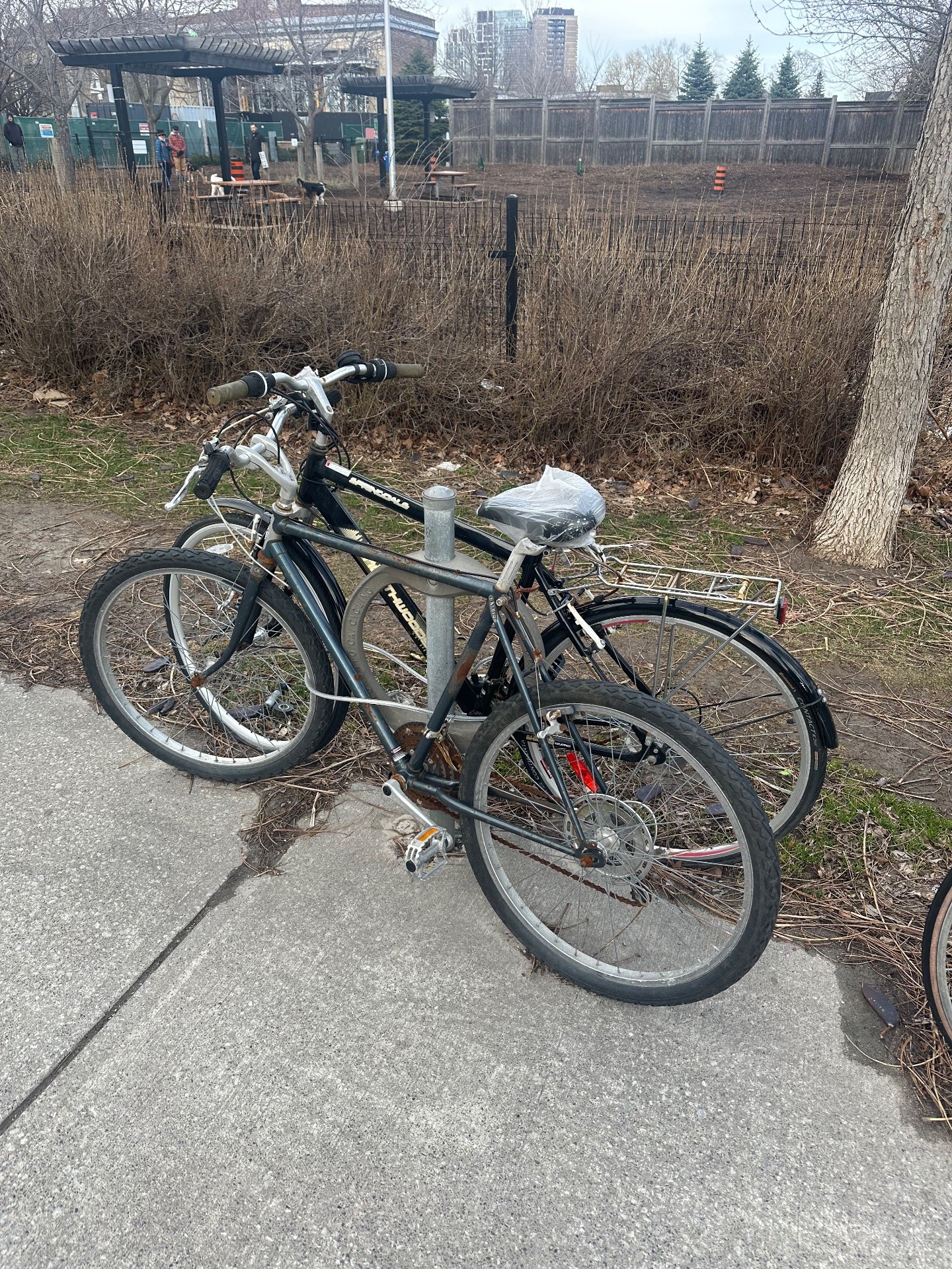 Two abandoned bicycles locked to a metal post in the park show significant deterioration with rust on frames, flat or severely worn tires, and accumulated dirt and debris. One bike has a plastic bag tied to the seat, and both appear to have been left unattended for an extended period, blocking the bicycle parking infrastructure.