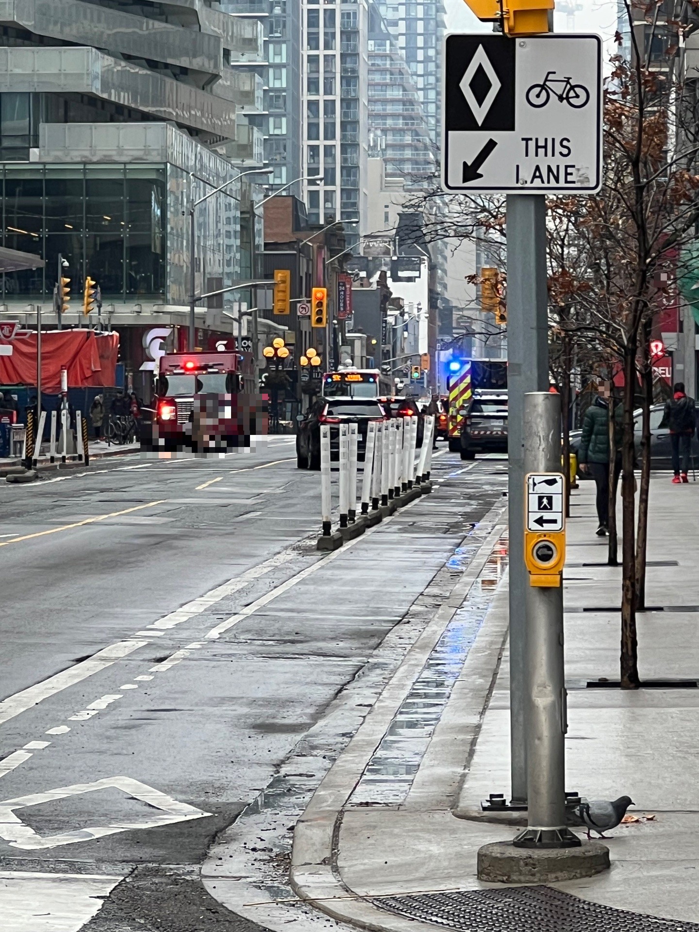 Concrete protective bollards are missing along a stretch of the bike lane on Yonge Street near Yorkville Avenue, leaving cyclists unprotected from vehicle traffic. The lane remains marked with overhead signage, but the gap in barriers exposes riders to cars, emergency vehicles, and delivery trucks. Remaining bollards visible further down the lane indicate this is a recent gap from construction work.