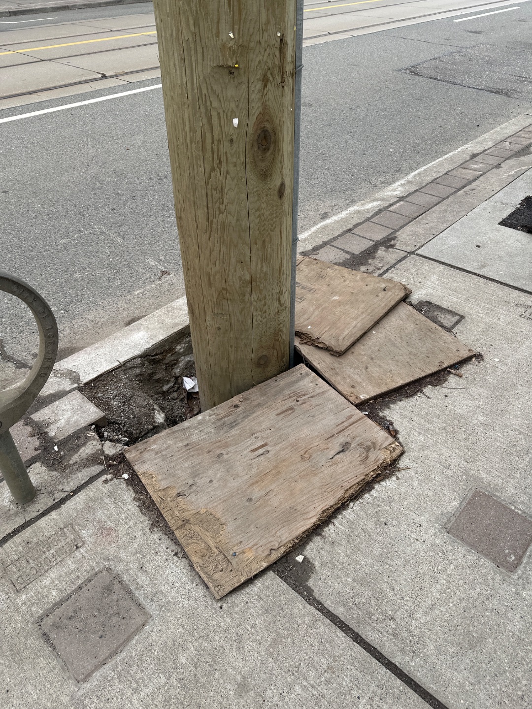 Wooden plywood sheets are stacked on the sidewalk around a utility pole at this busy intersection near Dundas St W, creating a tripping hazard and blocking the pedestrian path. The pole base is exposed with visible hardware, and the temporary protective covering appears improperly positioned. Multiple plywood pieces obstruct foot traffic in an area with active road restrictions.