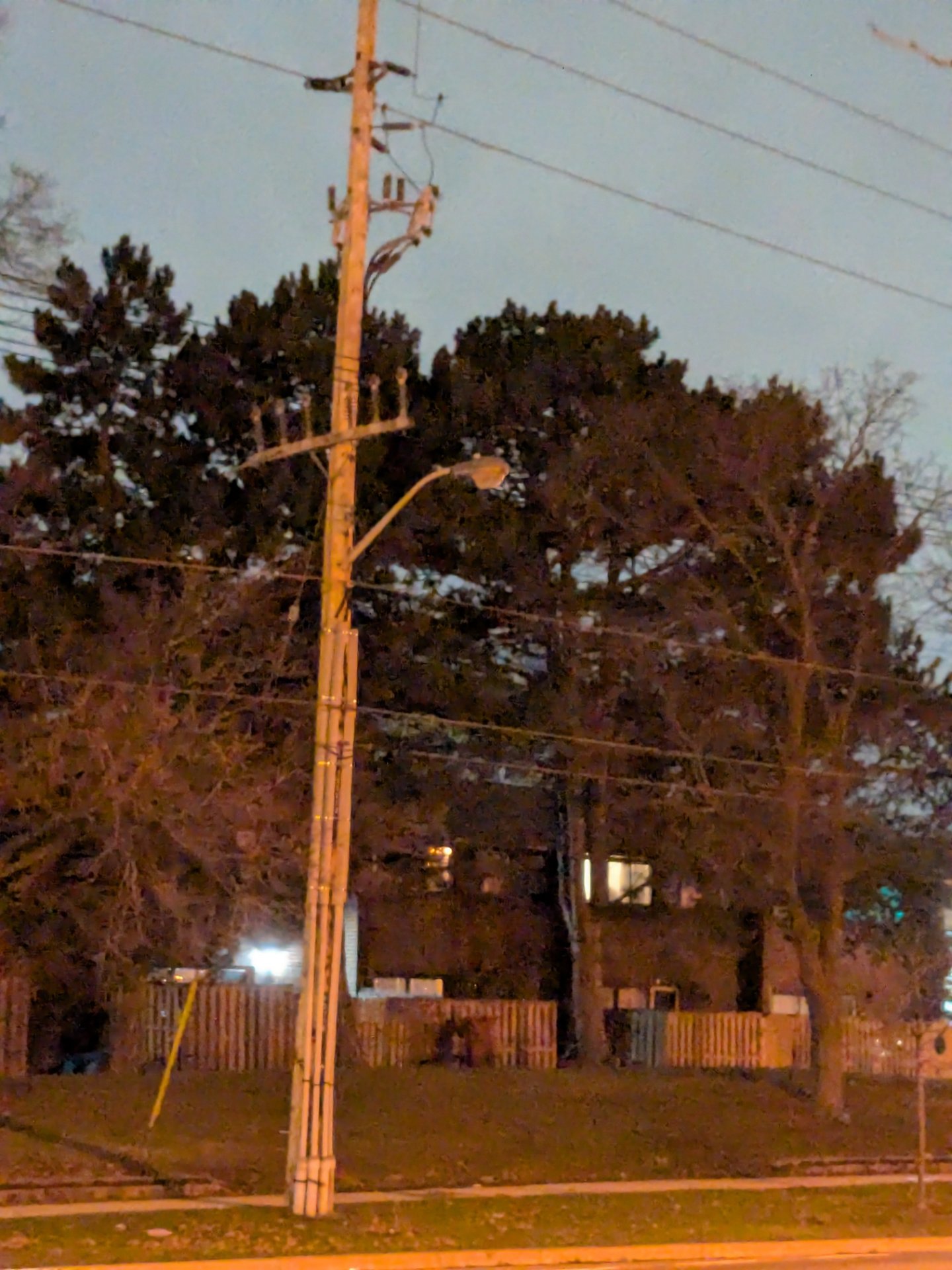 A wooden utility pole / streetlight at the intersection of Martin Grove Road and Silverstone Drive shows light fixture mounted not working.