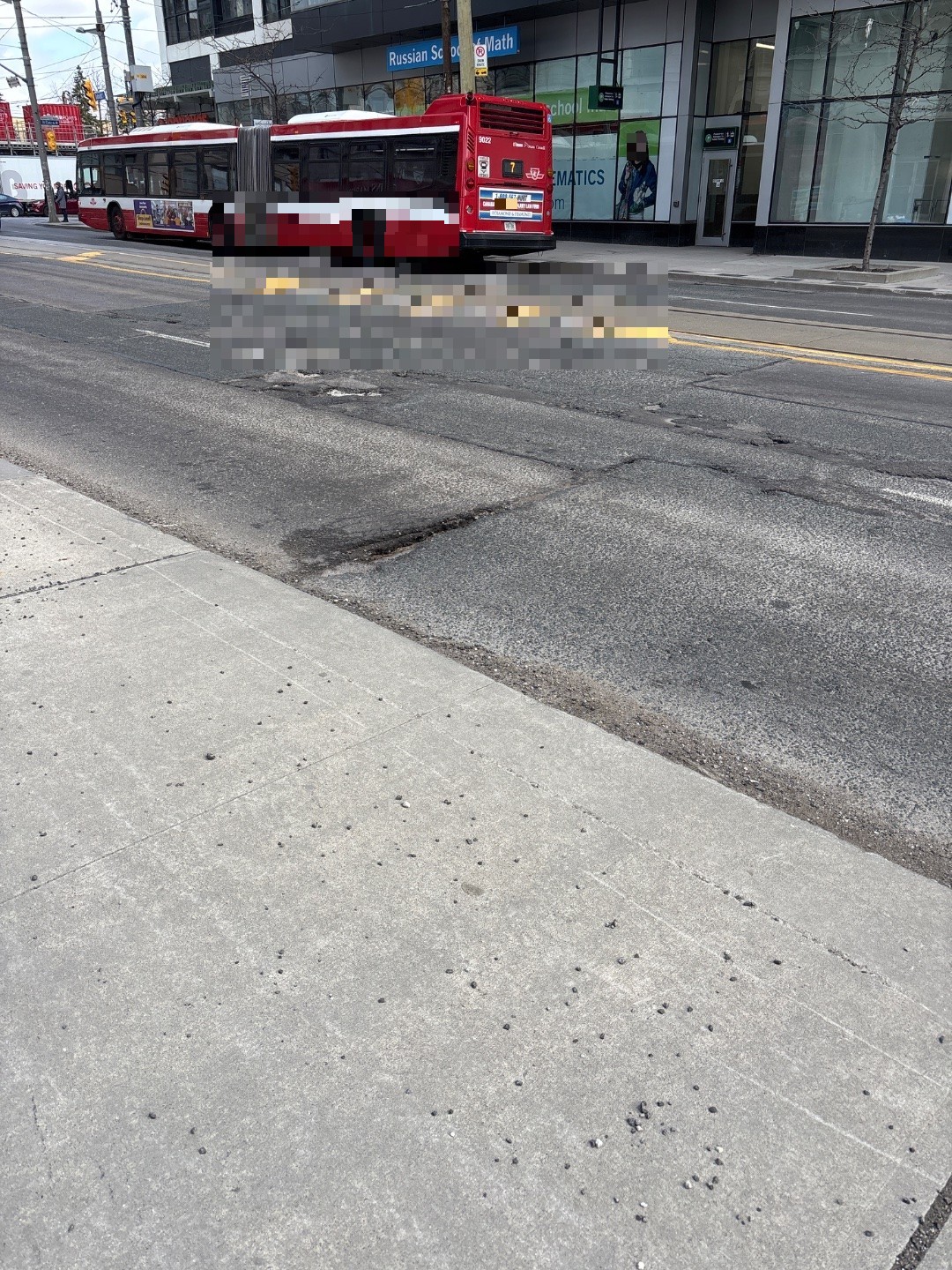 The road surface at this busy urban intersection has multiple areas of missing and sunken asphalt with visible depressions and uneven pavement sections spanning several metres. The deteriorated asphalt creates tripping hazards for pedestrians and damage risks for vehicles, including the TTC bus currently using this route. The underlying catch basin infrastructure in the area dates to 1911, which may be contributing to the pavement failure.