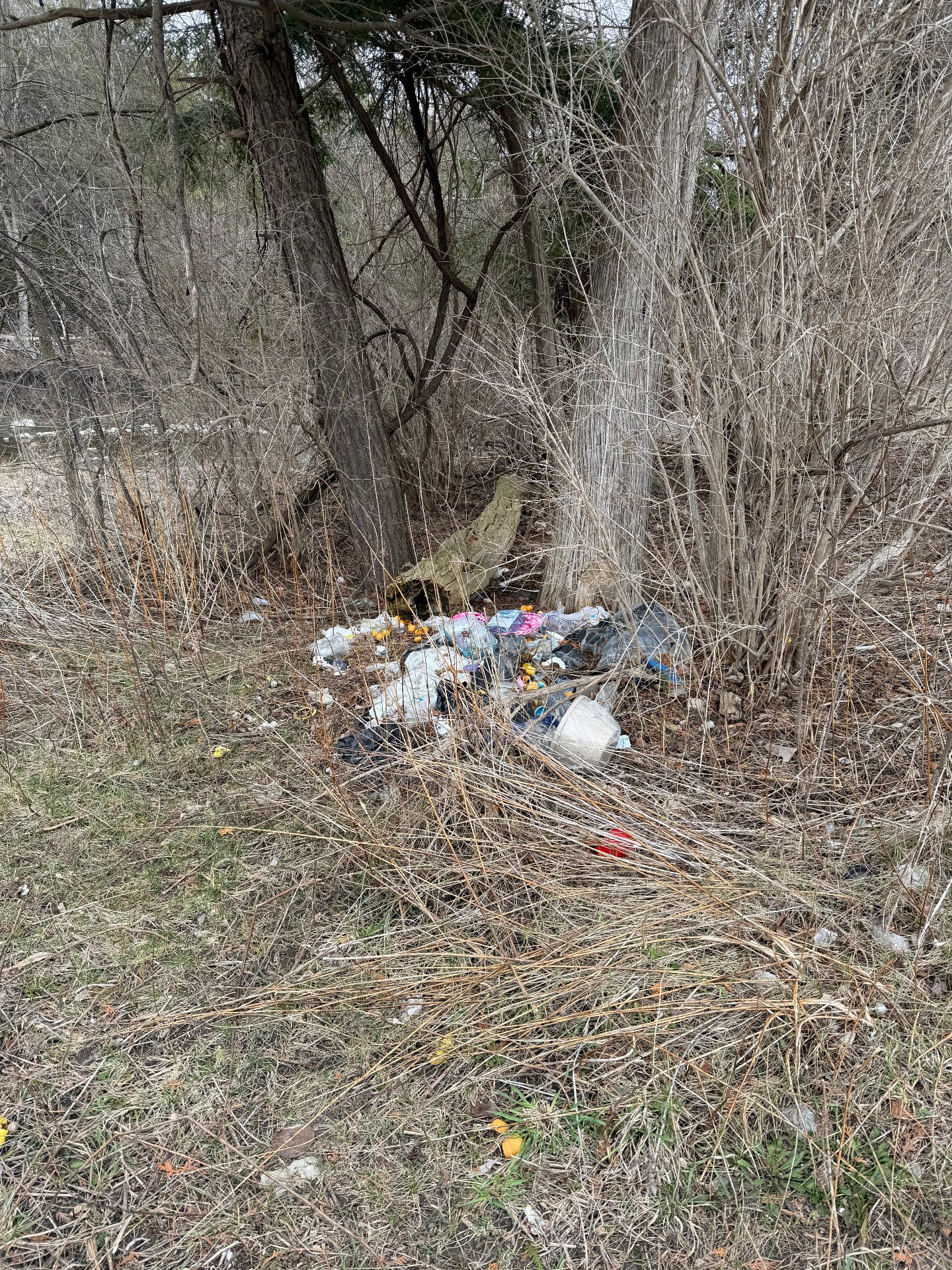Household waste dumped near river that is sensitive ecological habitat. The entire area should be spring cleaned