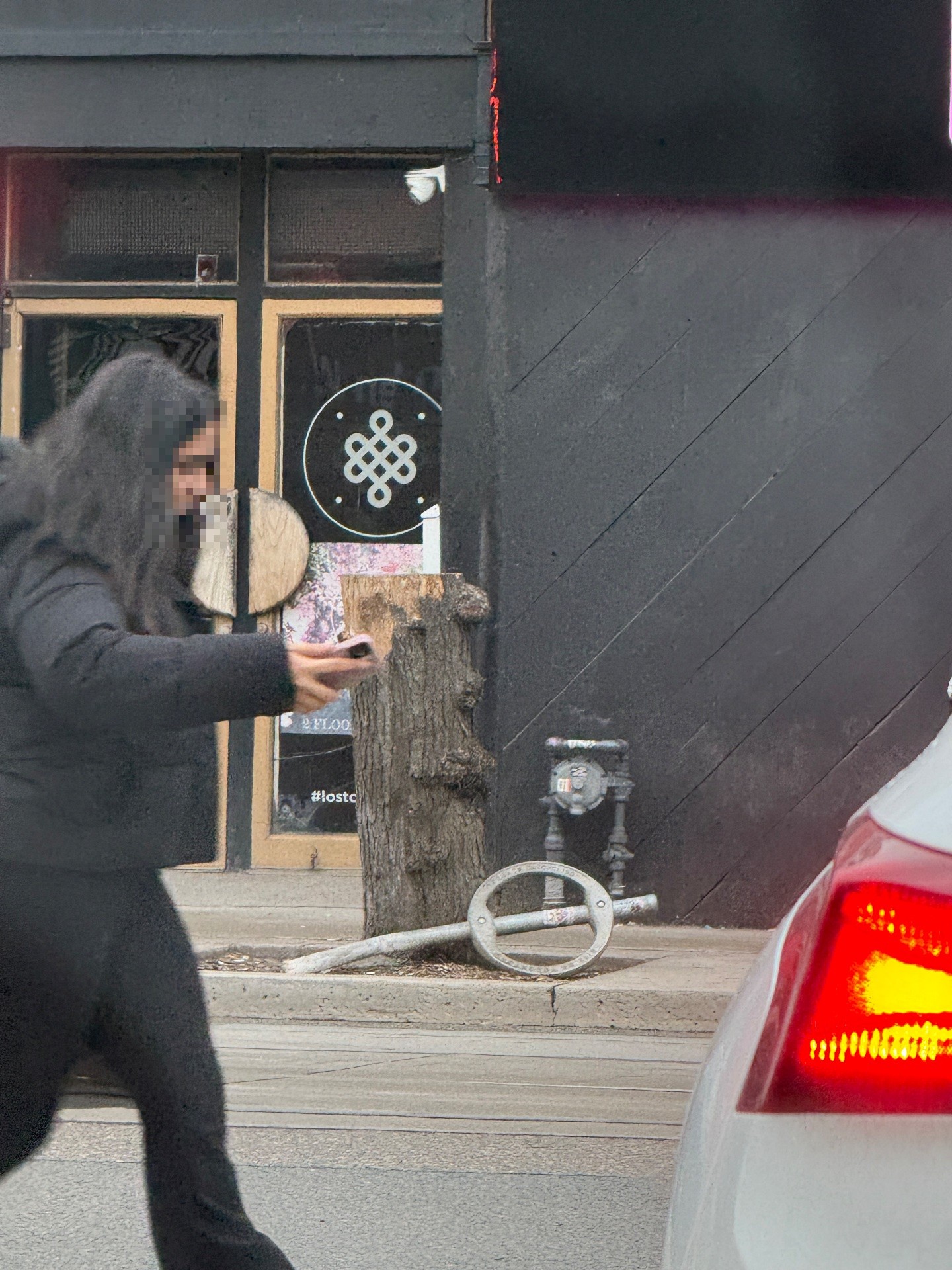A metal bicycle parking ring and post are lying on the sidewalk in front of a storefront at 512 Queen Street West, knocked down or damaged at the base. The fallen structure creates a tripping hazard and blocks access to the bicycle parking facility, with a dead tree stump visible behind it.