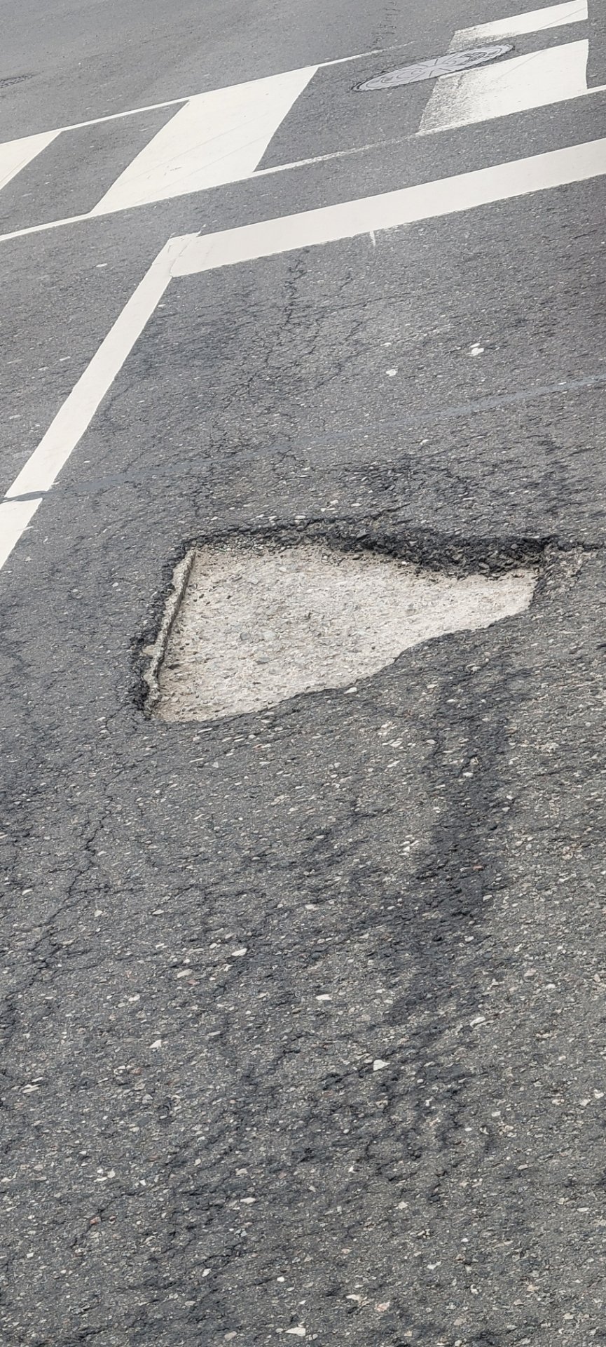 A sunken pothole repair approximately 18-24 inches long is visible at the pedestrian crosswalk on Eglinton Avenue West, where lighter-colored patching material has settled below the surrounding road level. The depressed surface creates a tripping hazard for pedestrians crossing at the marked crosswalk and a hazard for vehicle tires. Nearby aging catch basins (average installed 2004) and utility infrastructure suggest possible subsurface settlement or prior utility work contributed to the damage.