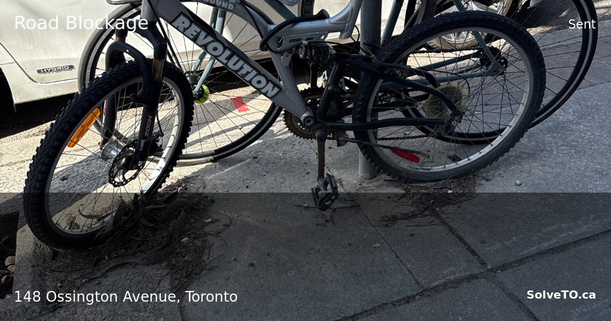 Two bicycles locked together are partially blocking the sidewalk at 148 Ossington Avenue, creating a tripping hazard and forcing pedestrians into the street. The bikes appear to be in active use but are positioned across the public right-of-way and need to be relocated to clear pedestrian passage.