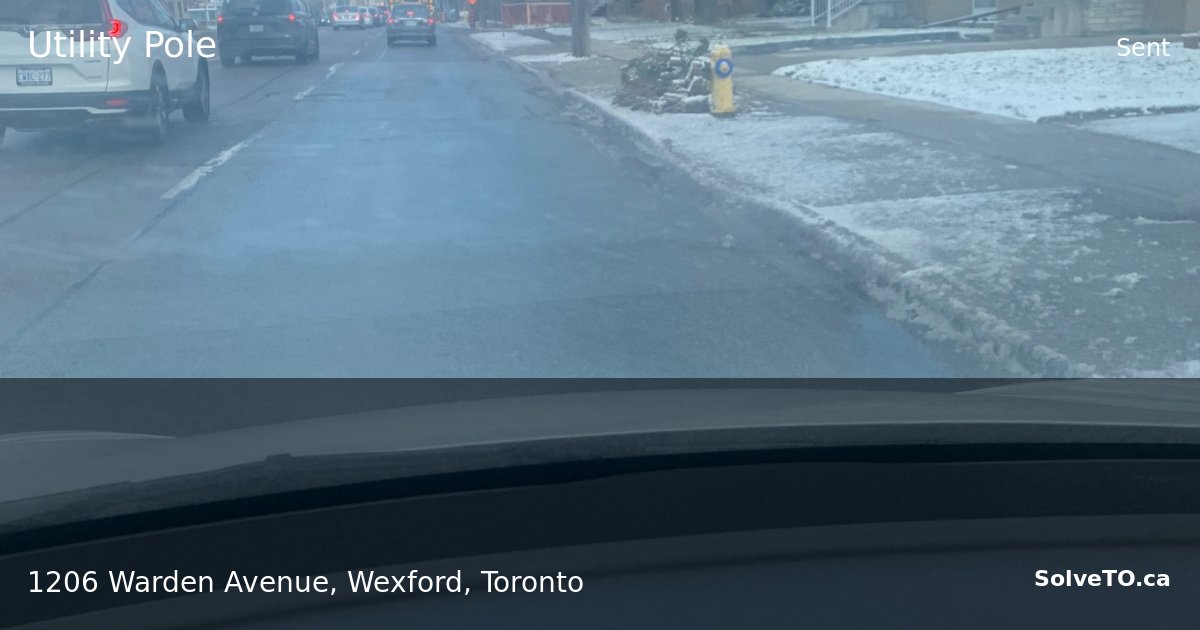 Wooden utility poles along Warden Avenue show signs of age with sagging and drooping overhead power and communication lines that require inspection for structural integrity and public safety. The sagging cables and potential pole deterioration pose a hazard in this high-pedestrian area near transit shelters.