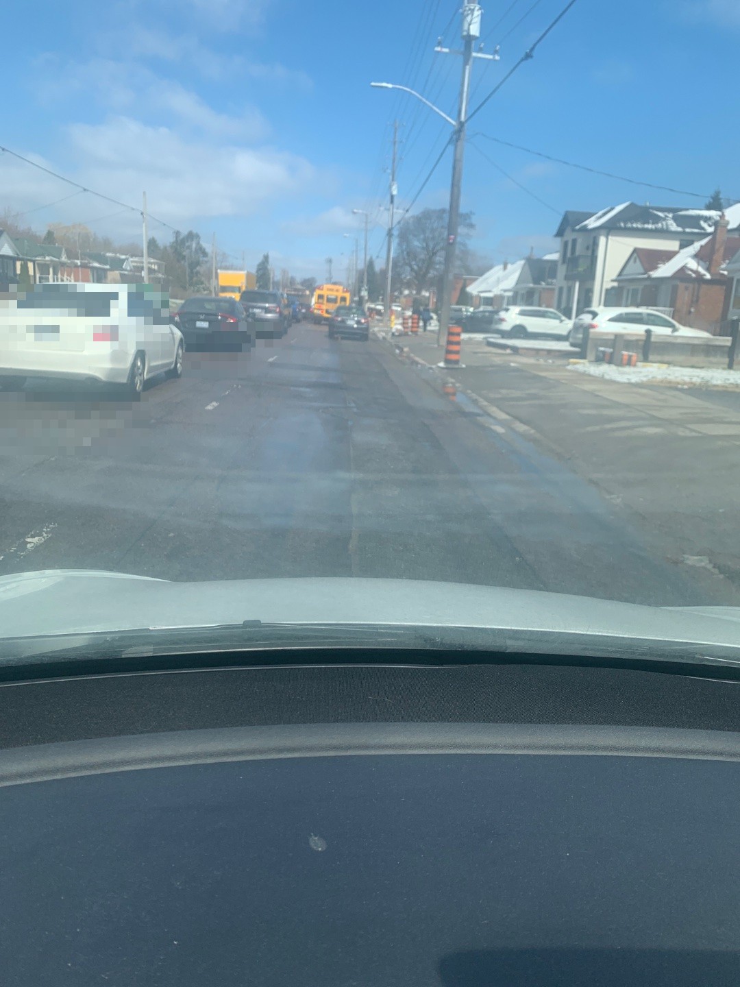 Active construction work is underway on Warden Avenue with heavy equipment and barriers blocking portions of the street, restricting traffic flow and creating hazards for vehicles and pedestrians. Underground utility work on a catch basin/sewer access is in progress, with construction materials positioned across the roadway. Multiple vehicles are navigating around the work zone.