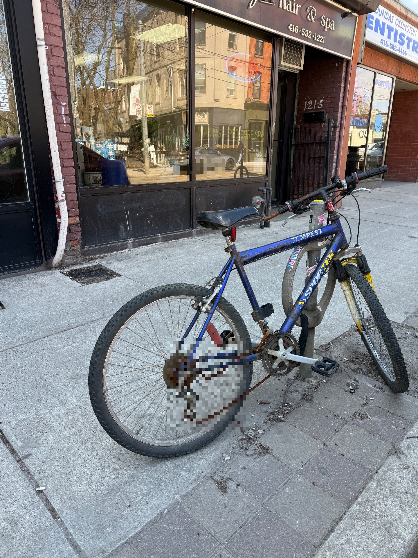 One blue bicycle is locked to a post on the sidewalk in front of a commercial storefront at 1215 Dundas Street West, showing heavy rust on the drivetrain and chain, deteriorated grips, and accumulated dirt. The bike has been abandoned for several months and is obstructing the sidewalk.