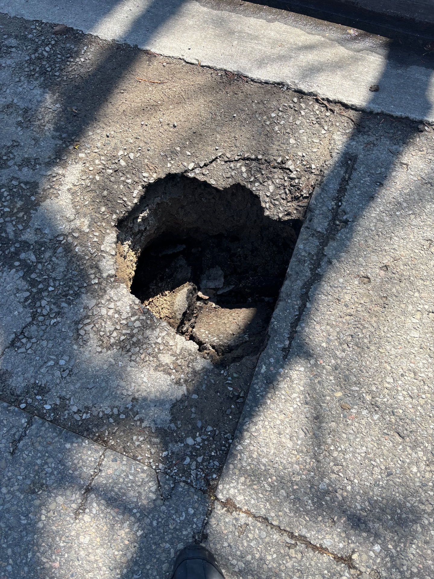 A large pothole approximately 12-18 inches in diameter with crumbling edges is present in the asphalt on Verwood Avenue near a catch basin. The hole exposes subsurface material and is surrounded by deteriorating asphalt and loose debris, creating a tripping hazard for pedestrians and potential vehicle damage risk.