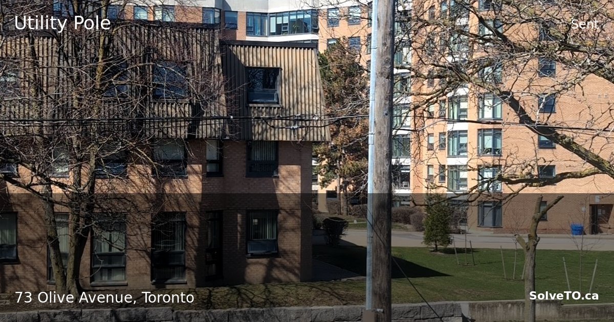 Wooden utility pole at 73 Olive Avenue has visible weathering and tangled wiring around the transformer box, with some sagging connections near the top that warrant maintenance review. The pole is located in a high-pedestrian area near a transit shelter, making equipment deterioration a potential safety concern.