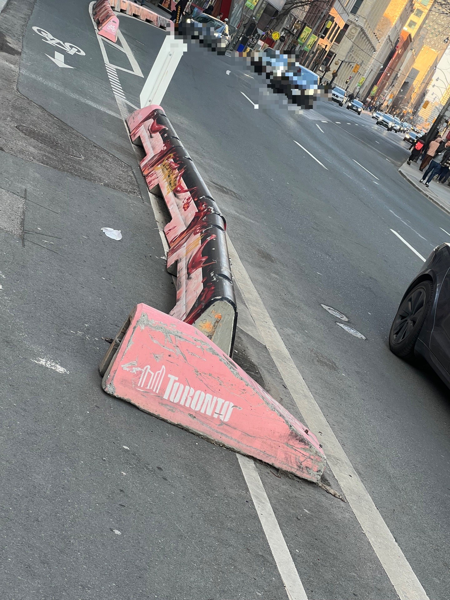 A large pink/red concrete bollard is lying diagonally across the street at the intersection of Richmond Street West and Peter Street, blocking both the roadway and sidewalk. The displaced barrier creates a tripping hazard for pedestrians and an obstruction for vehicles and requires urgent removal.